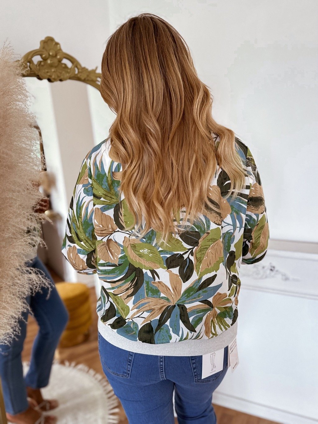 Bunda z tenké vzorované látky se zipem. Modelka měří 168 cm a má na sobě velikost XL.