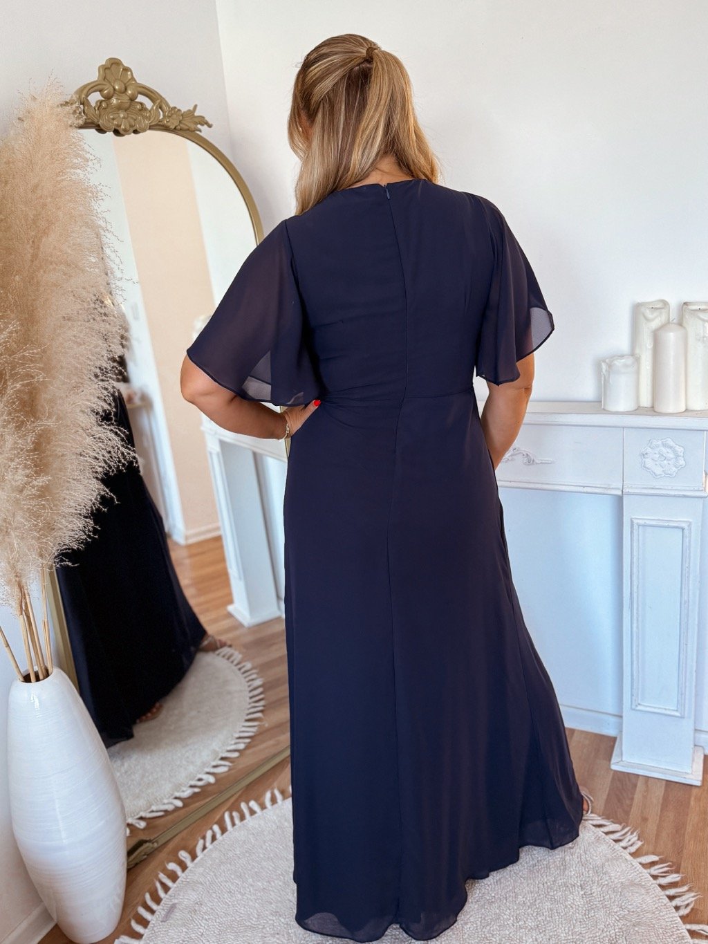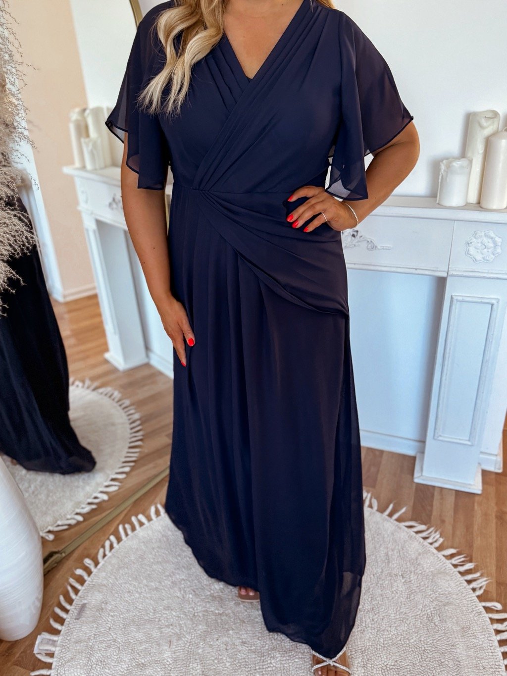 Dlouhé společenské šaty pro plnoštíhlé s krátkým rukávem. Šaty mají na zádech zip a na hrudi měkkou pěnovou vycpávku. Modelka měří 168 cm a má na sobě velikost XL.