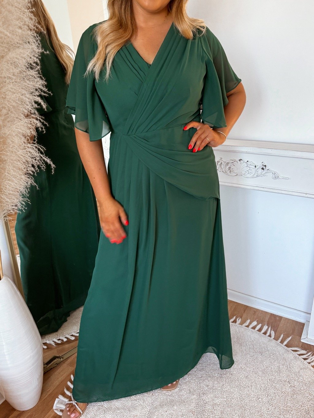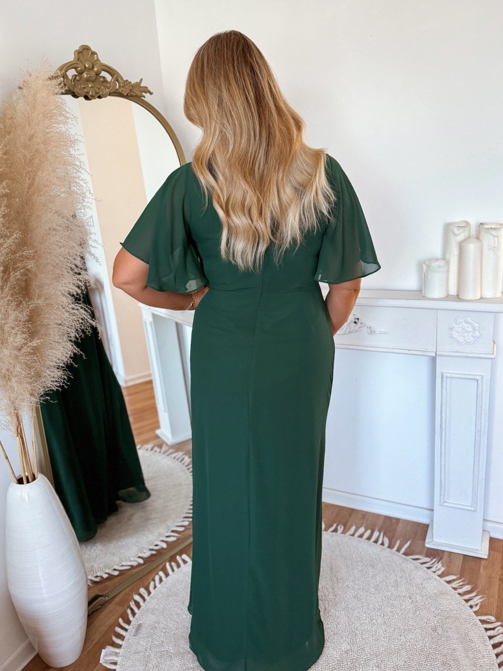 Dlouhé společenské šaty pro plnoštíhlé s krátkým rukávem. Šaty mají na zádech zip a na hrudi měkkou pěnovou vycpávku. Modelka měří 168 cm a má na sobě velikost XL.