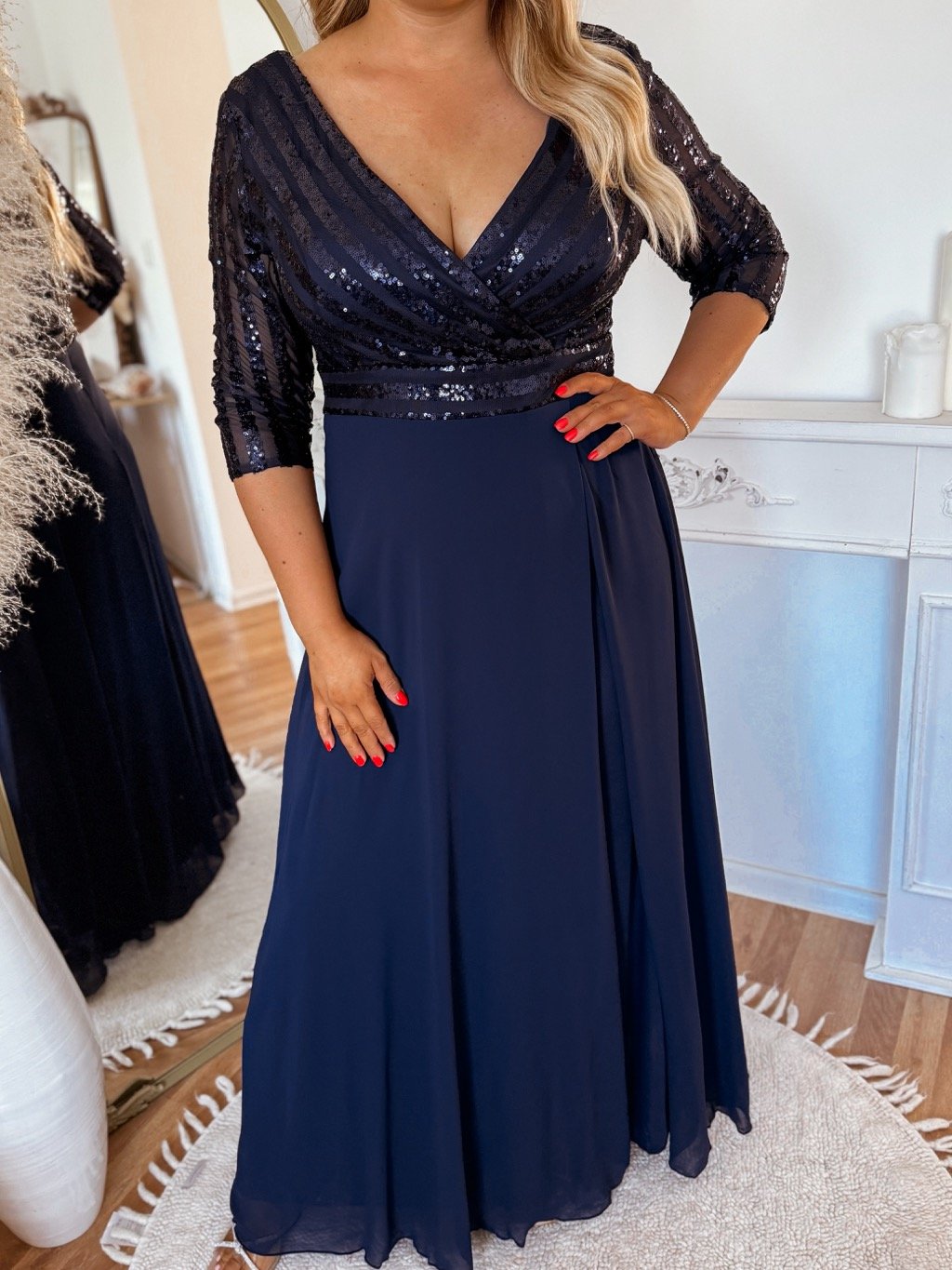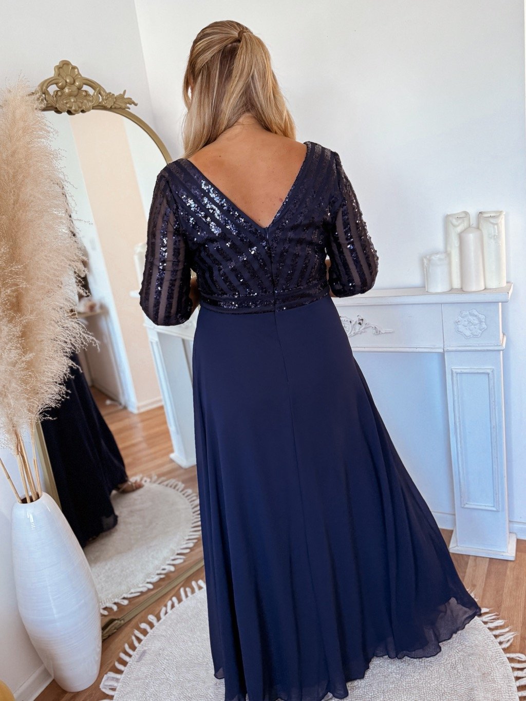 Zazářete na každé speciální příležitosti s těmito nádhernými večerními šaty v odstínu tmavě modré. Dlouhé společenské šaty s flitrovaným topem a rozparkem na sukni. Šaty mají měkké pěnové polstrování. Na zadní straně je zapínání na zip. Modelka měří 168 cm a má na sobě velikost XL.