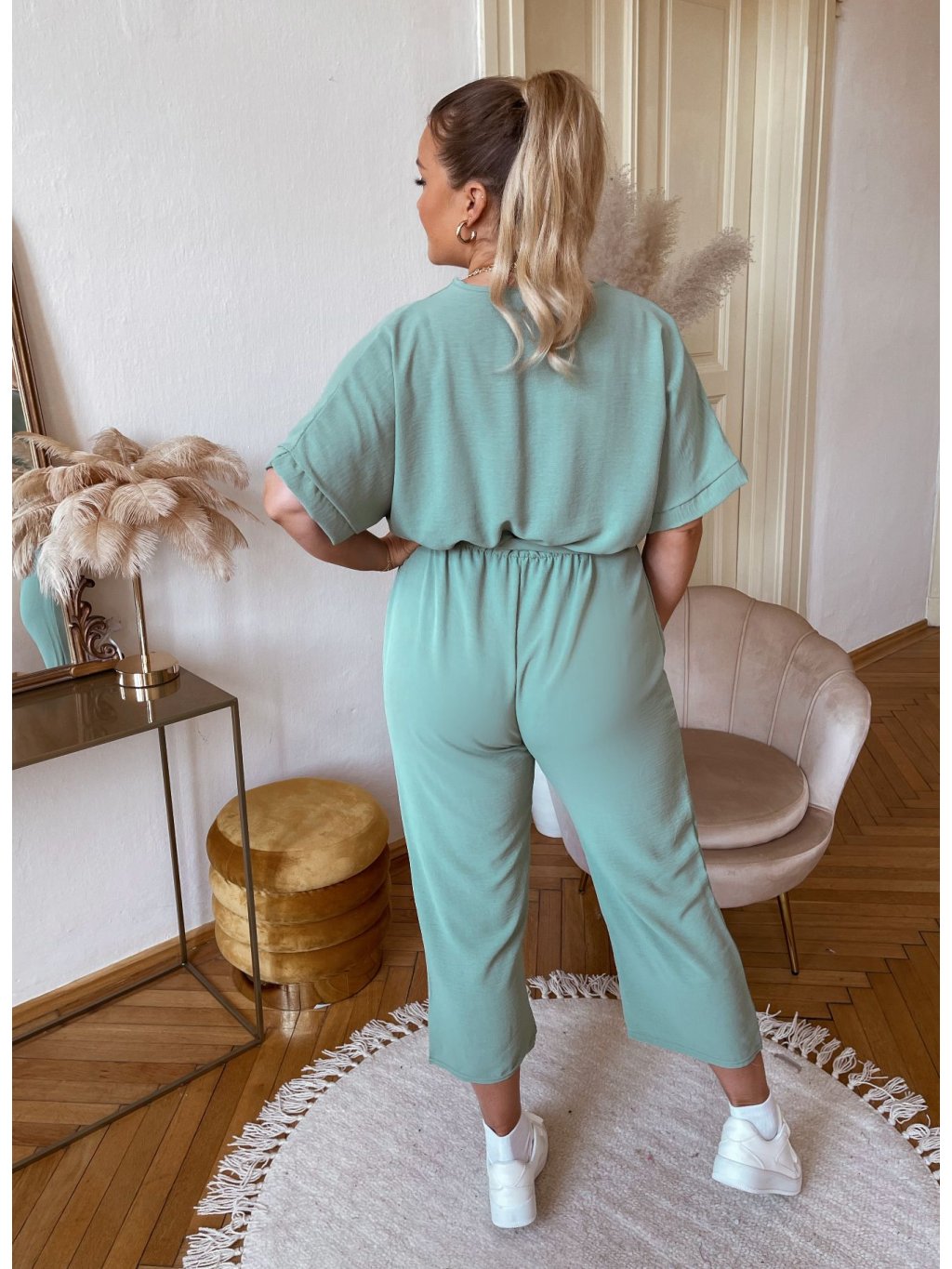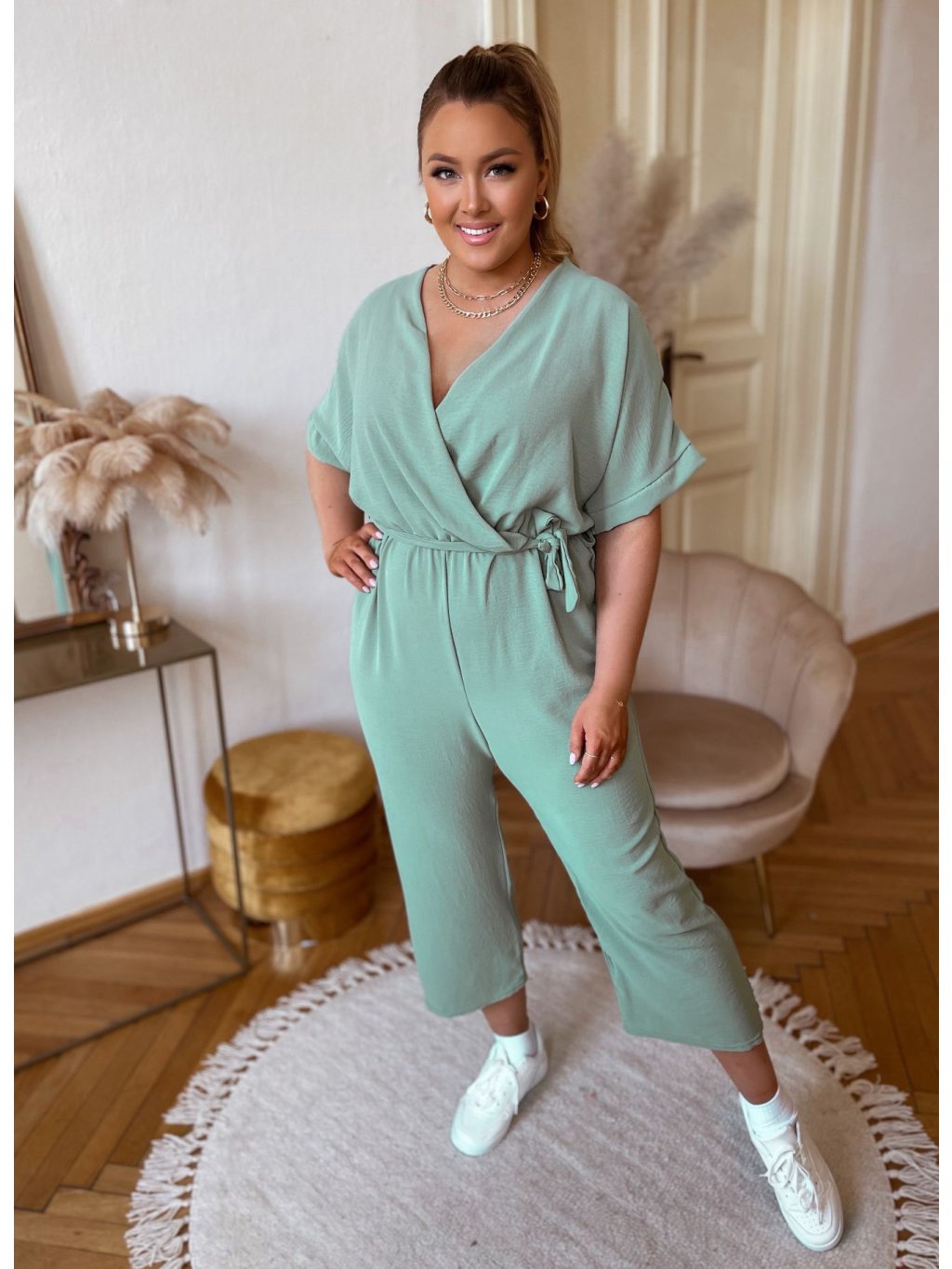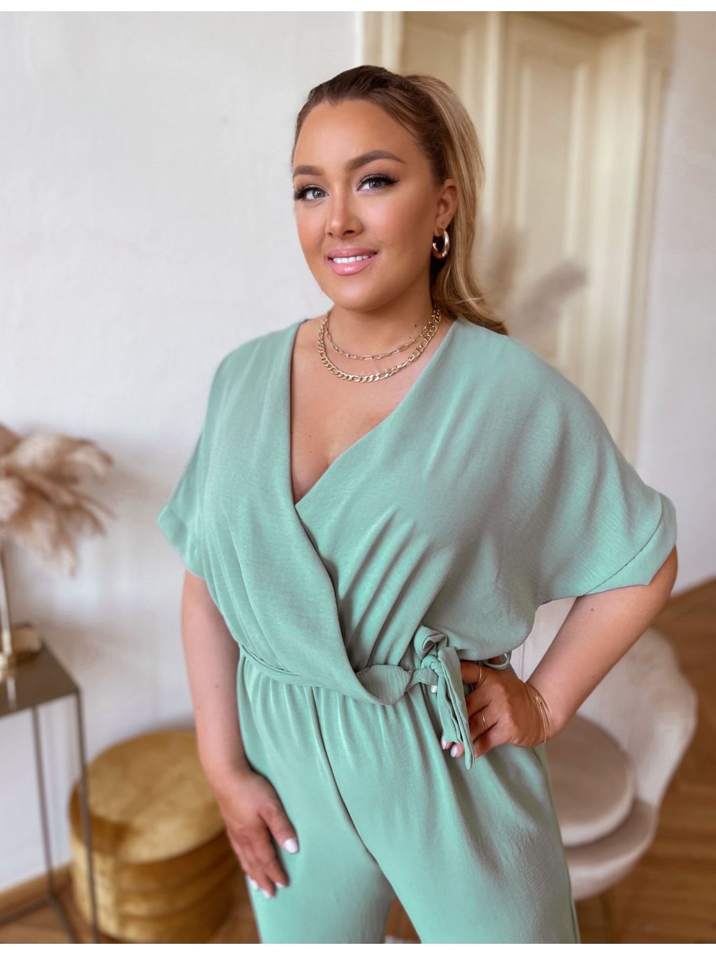 Trendy overál s nohavicami rovného strihu, krátkym rukávom a hlbokým výstrihom. V páse je všitá elastická gumička. Overál je elastický a prispôsobí sa postave. Modelka meria 168 cm a má na sebe veľkosť L/XL.