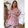 Krátké květované šaty s pružným pasem a páskem. Modelka měří 168 cm a má na sobě velikost XL.