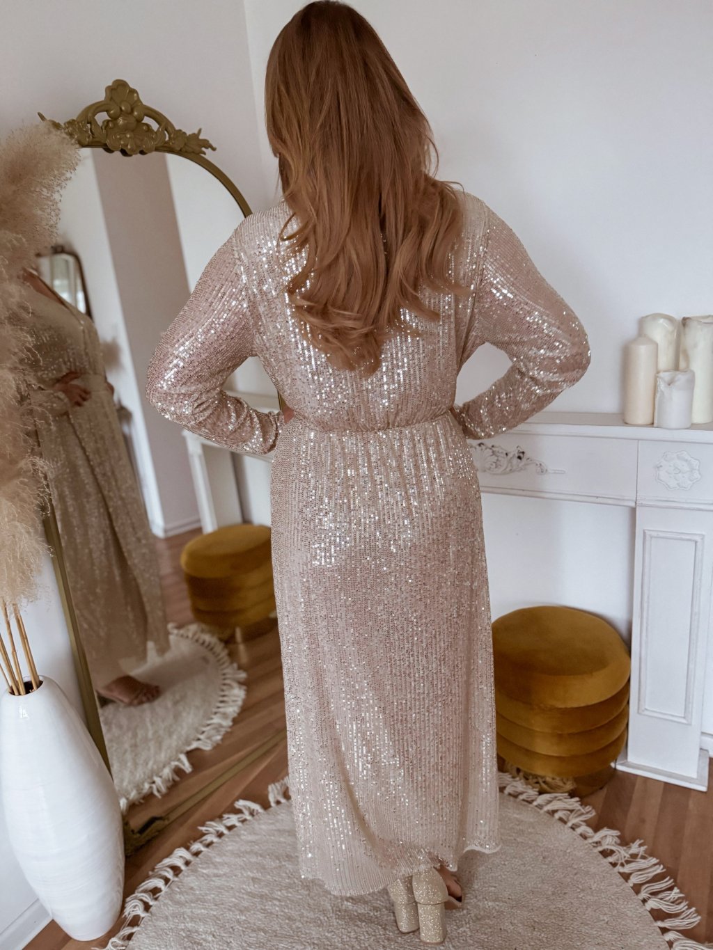 Flitrové plesové šaty mají volnější střih. Šaty mají výstřih do V, dlouhé rukávy, řasení na bocích a asymetrický lem s rozparkem, který zvýrazňuje postavu. Ideální pro slavnostní příležitosti nebo plesy. Modelka měří 168 cm a má na sobě velikost XL/XXL.