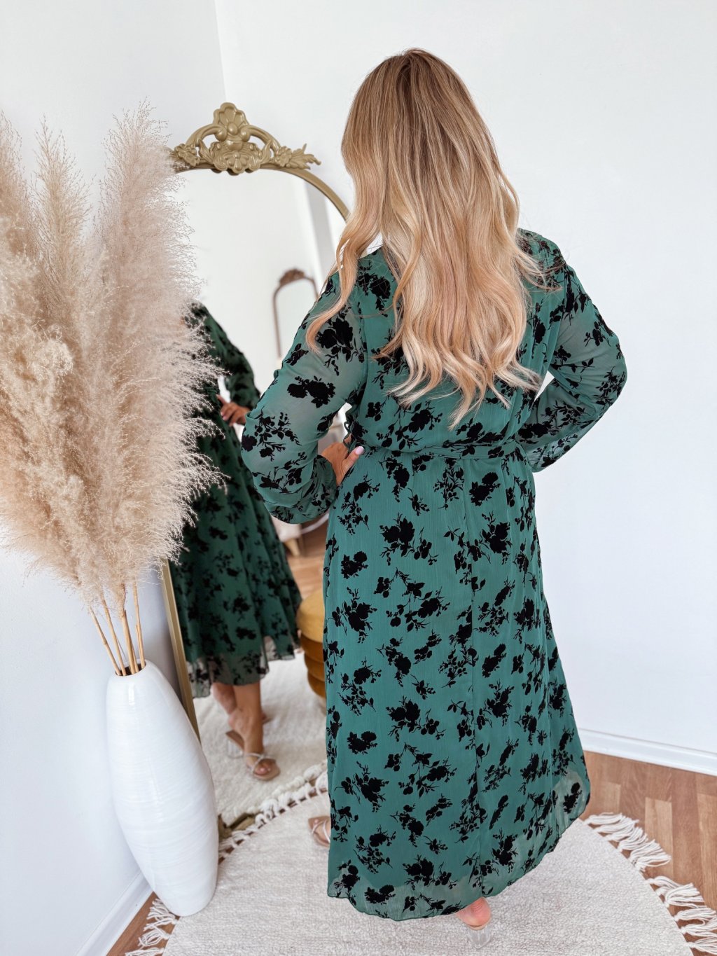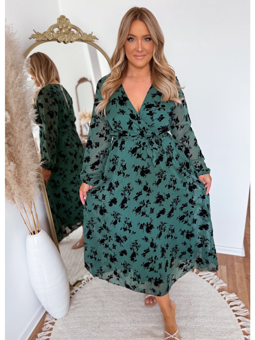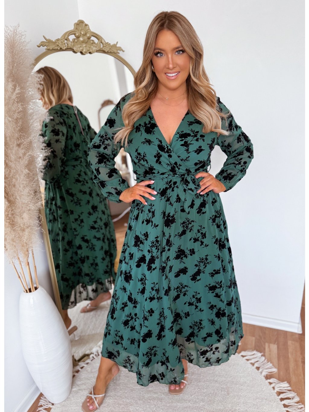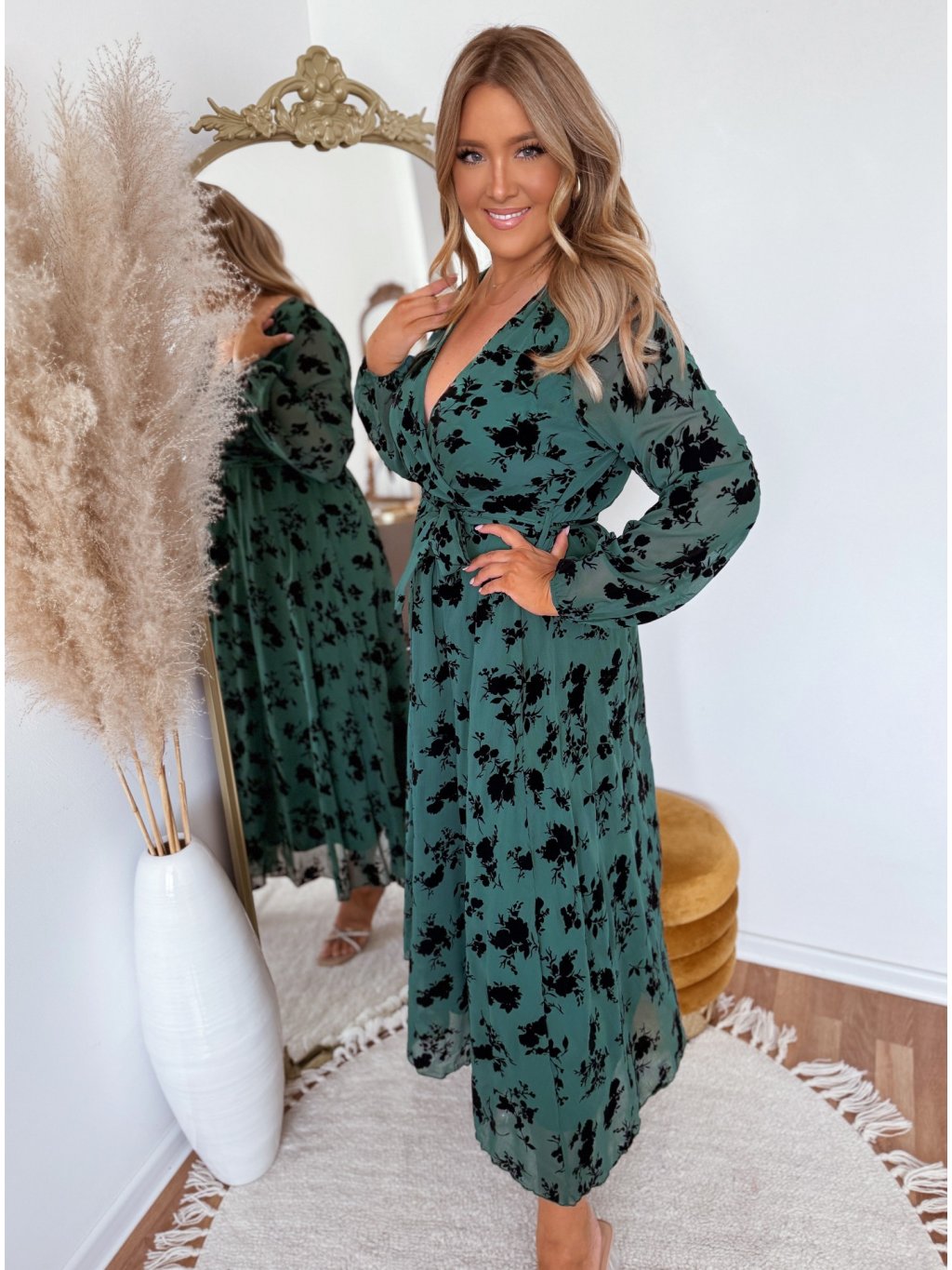 Zelené šaty se sametovými květinami