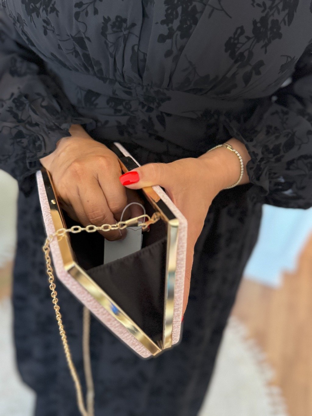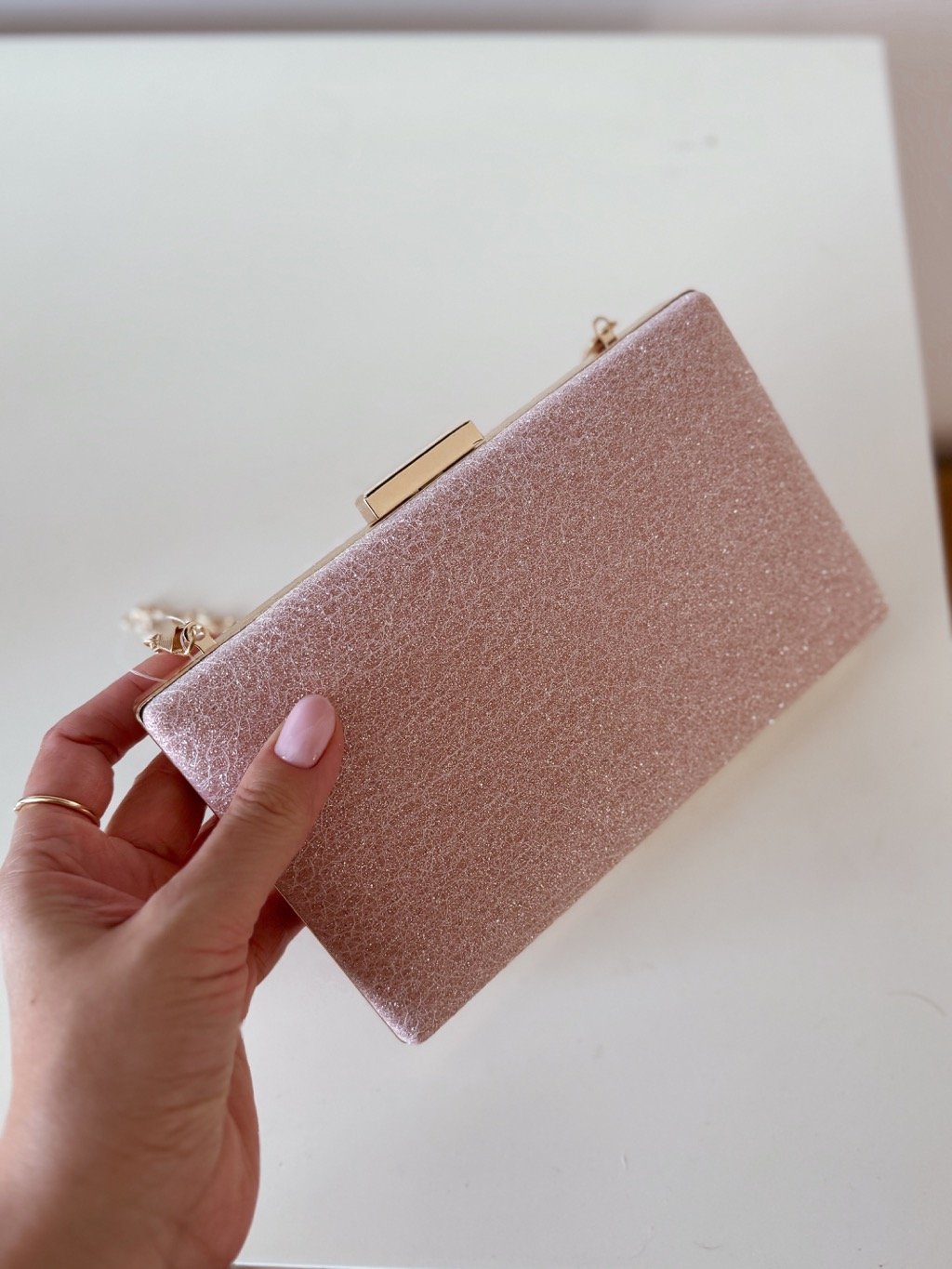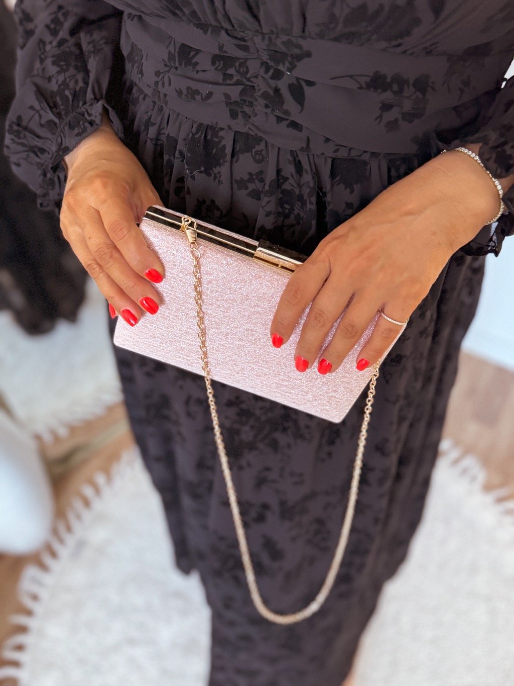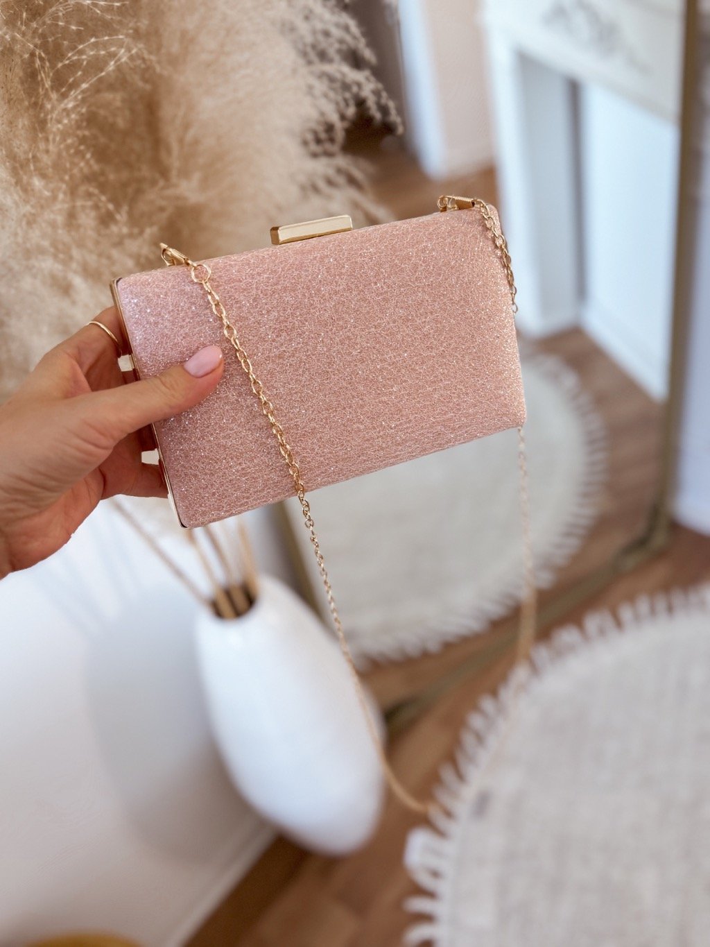 Tato stylová listová kabelka v jemném růžovozlatém odstínu je ideálním doplňkem pro společenské události, svatby či večerní oslavy. Povrch s třpytivým efektem působí luxusně a elegantně, zatímco zlaté kovové zapínání a řetízkové ramínko dodávají kabelce moderní šmrnc.
