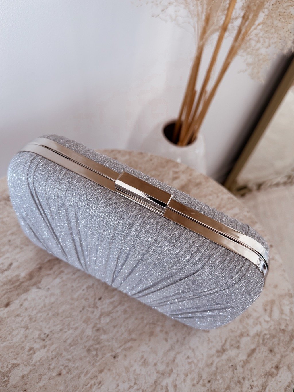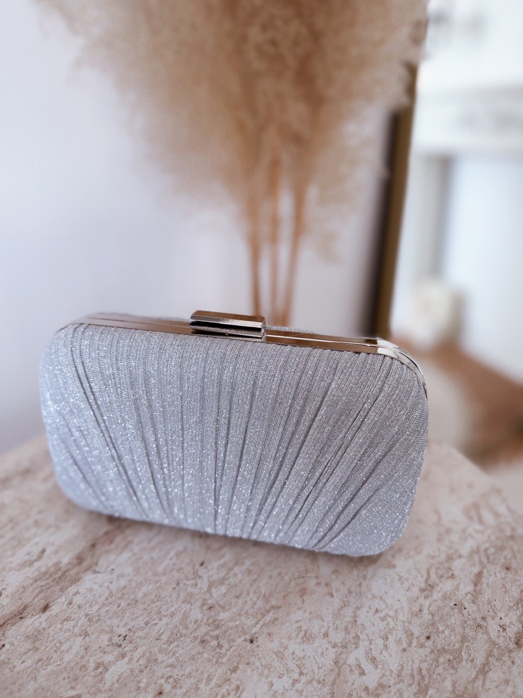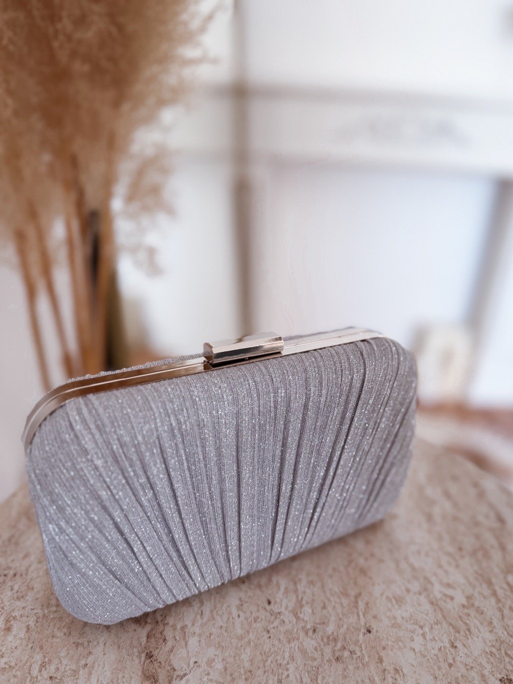 Elegantní večerní kabelka s jemným plisovaným designem a třpytivým povrchem je dokonalým doplňkem na svatby, plesy či večerní oslavy. Zlaté detaily a řetízkové ramínko dodávají kabelce luxusní nádech, přičemž ji můžete nosit v ruce nebo pohodlně na rameni.