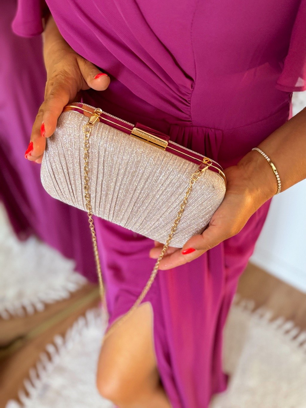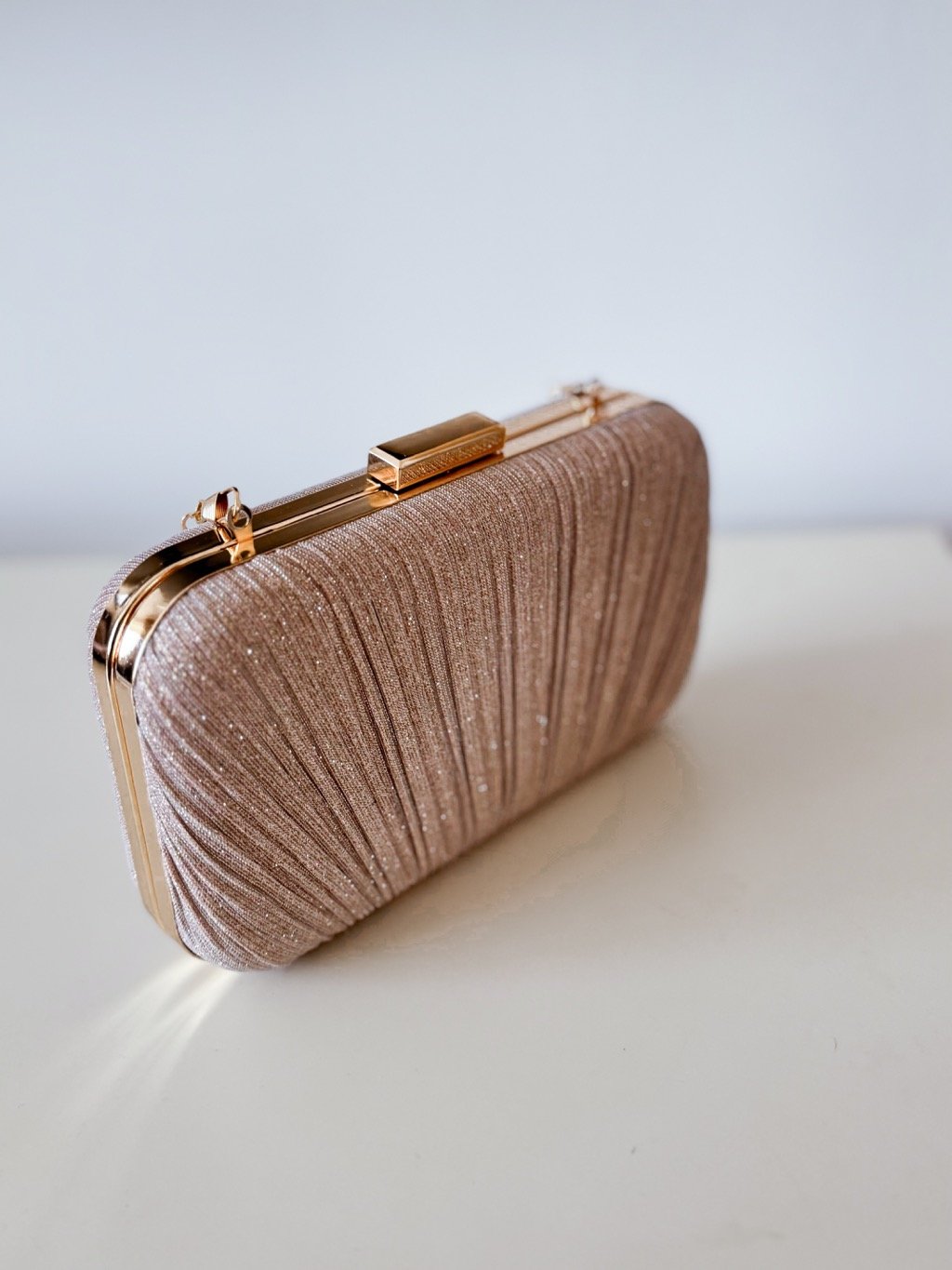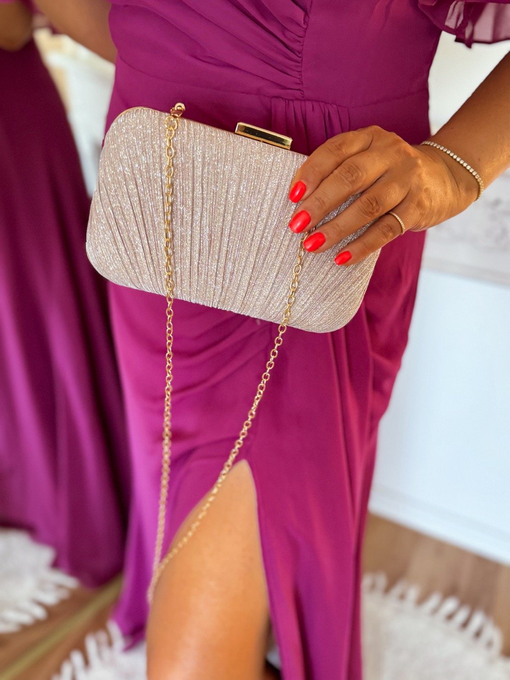 Elegantní večerní kabelka s jemným plisovaným designem a třpytivým povrchem je dokonalým doplňkem na svatby, plesy či večerní oslavy. Zlaté detaily a řetízkové ramínko dodávají kabelce luxusní nádech, přičemž ji můžete nosit v ruce nebo pohodlně na rameni.