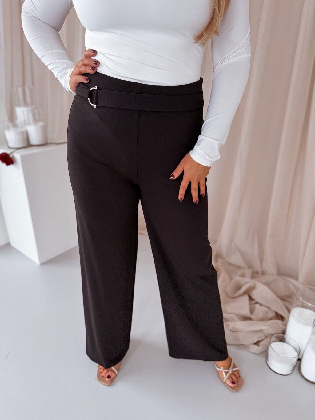 Elegantní kalhoty jsou elastické, mají zapínání na zip na boku. Modelka měří 168 cm a má na sobě velikost XL.