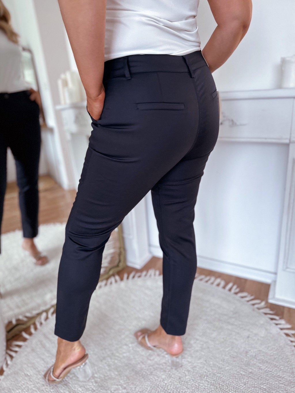 Elastické bavlněné chino kalhoty s vysokým pasem pro plnoštíhlé, kapsami a zapínáním na zip. Modelka měří 168 cm a má na sobě velikost 44.