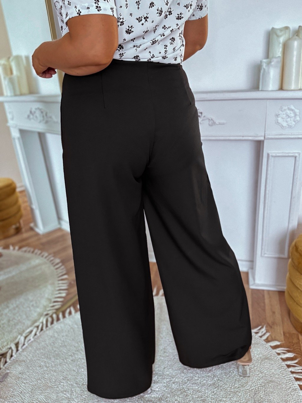Elegantní dámské černé kalhoty pro moletky jsou mírně elastické, mají vázání na boku. Modelka měří 168 cm a má na sobě velikost XL.