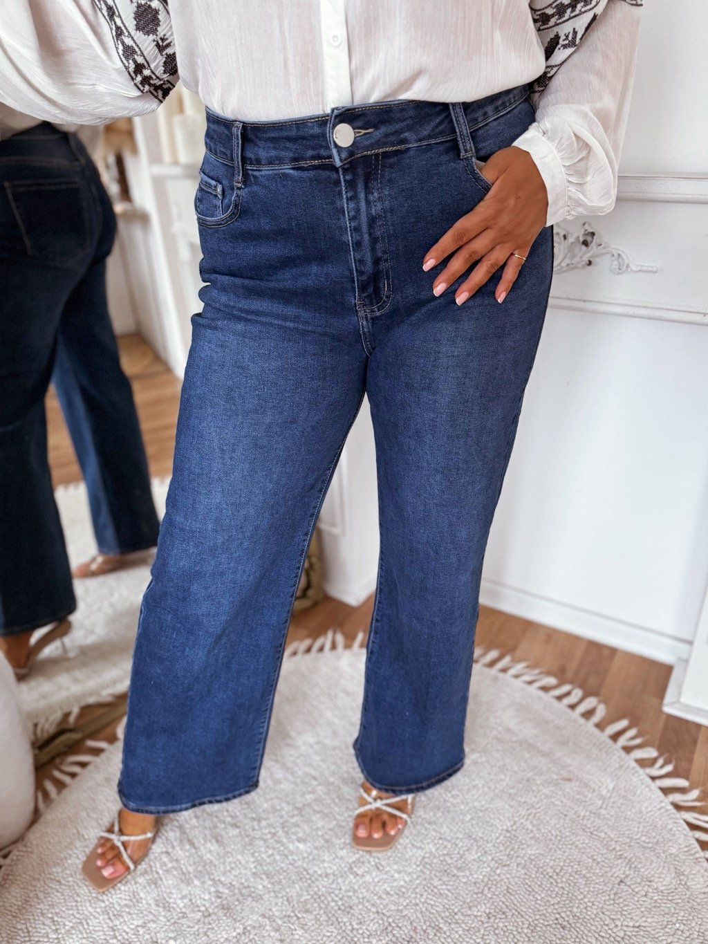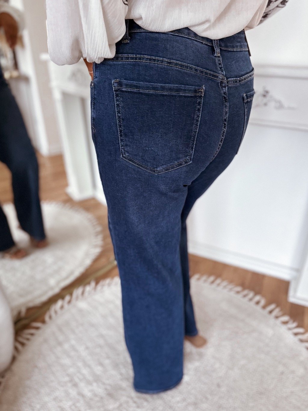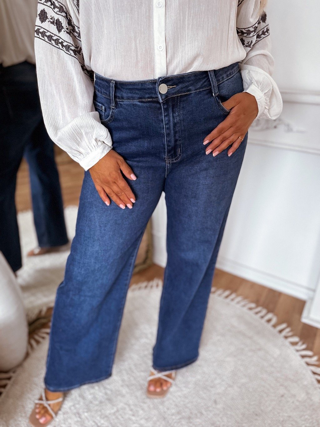 Elastické rifle pro plnoštíhlé s kapsami a vysokým pasem. Kalhoty se přizpůsobí postavě. Modelka měří 168 cm a má na sobě velikost 44.