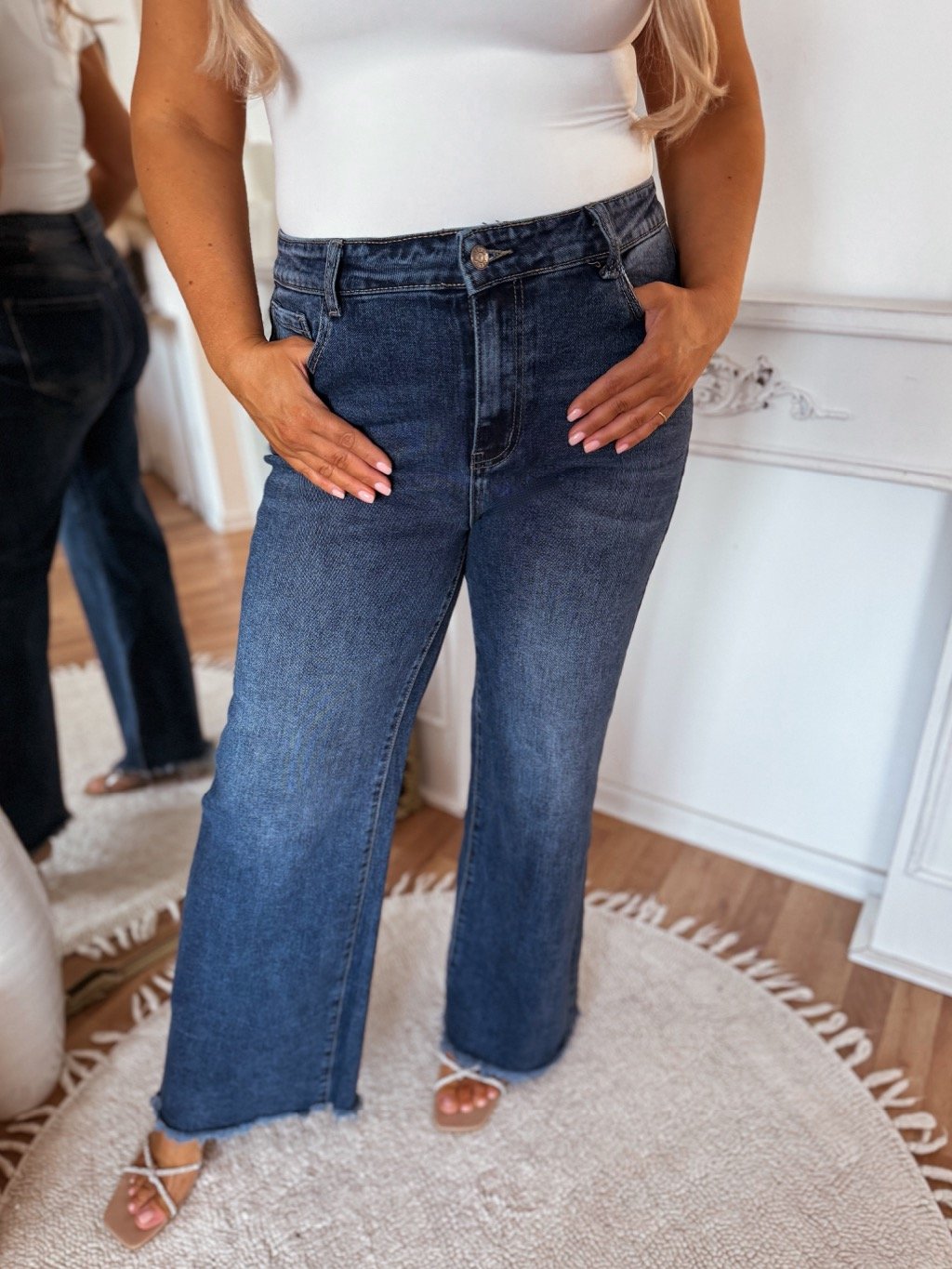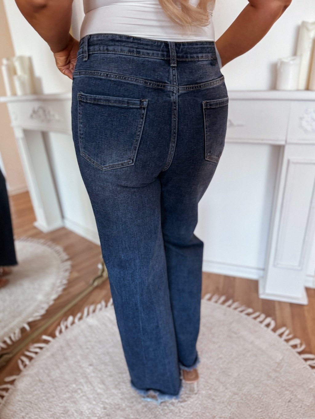 Elastické rifle pro plnoštíhlé s kapsami a vysokým pasem. Kalhoty se přizpůsobí postavě. Modelka měří 168 cm a má na sobě velikost 44.