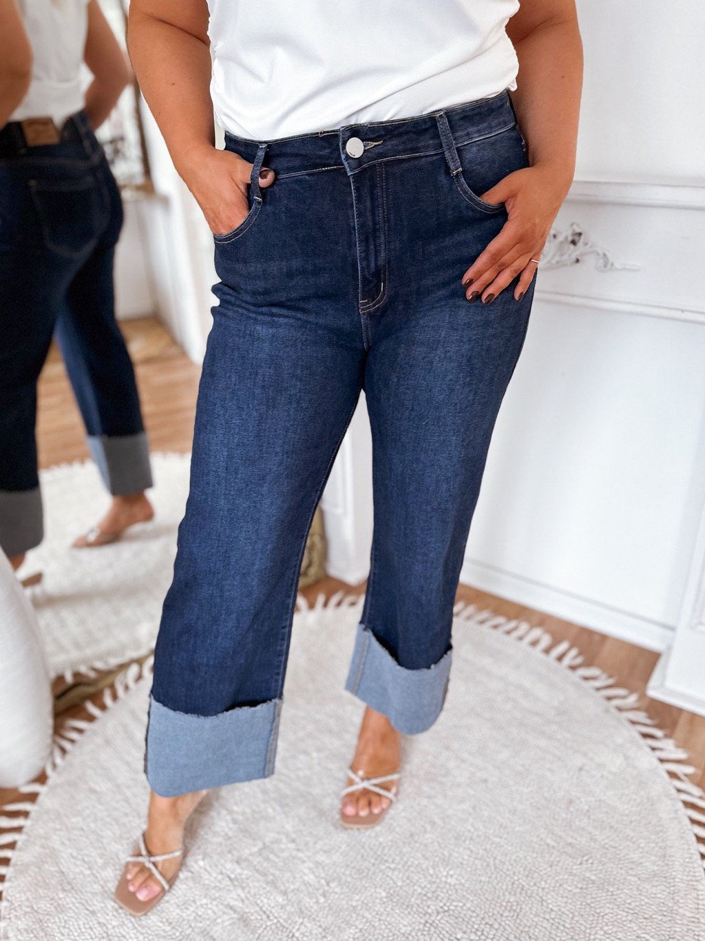 Tmavě modré rifle s rozšířeným střihem a výrazným kontrastním lemem jsou stylovým kouskem, který oživí každý šatník. Vyšší pas krásně zvýrazní postavu a pohodlný denim zajistí komfort po celý den. Spodní lem ve světlejším odstínu dodává riflím originální vzhled. Ideální k tričku, halence či saku – pro běžný den i neformální večer. Modelka měří 168 cm a má na sobě velikost 44.