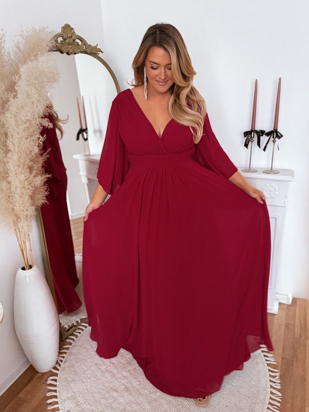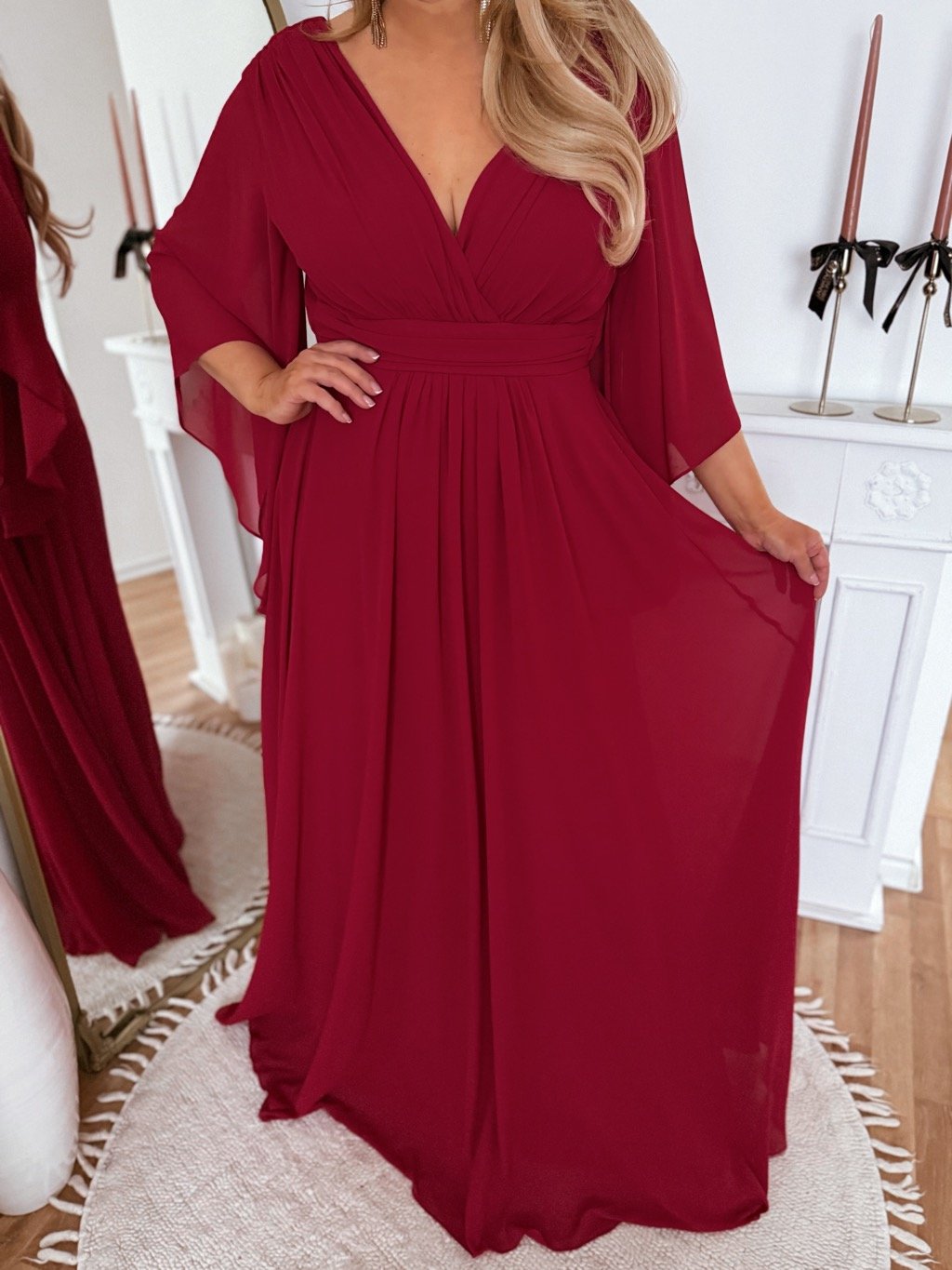 Dlhé spoločenské šaty s hlbokým výstrihom a výrazným dramatickým rukávom. Spoločenské šaty pre moletky majú všitú elastickú gumičku v páse zo zadnej strany. Sukňa je úplne voľná. Modelka meria 168 cm a má na sebe veľkosť XL (42).