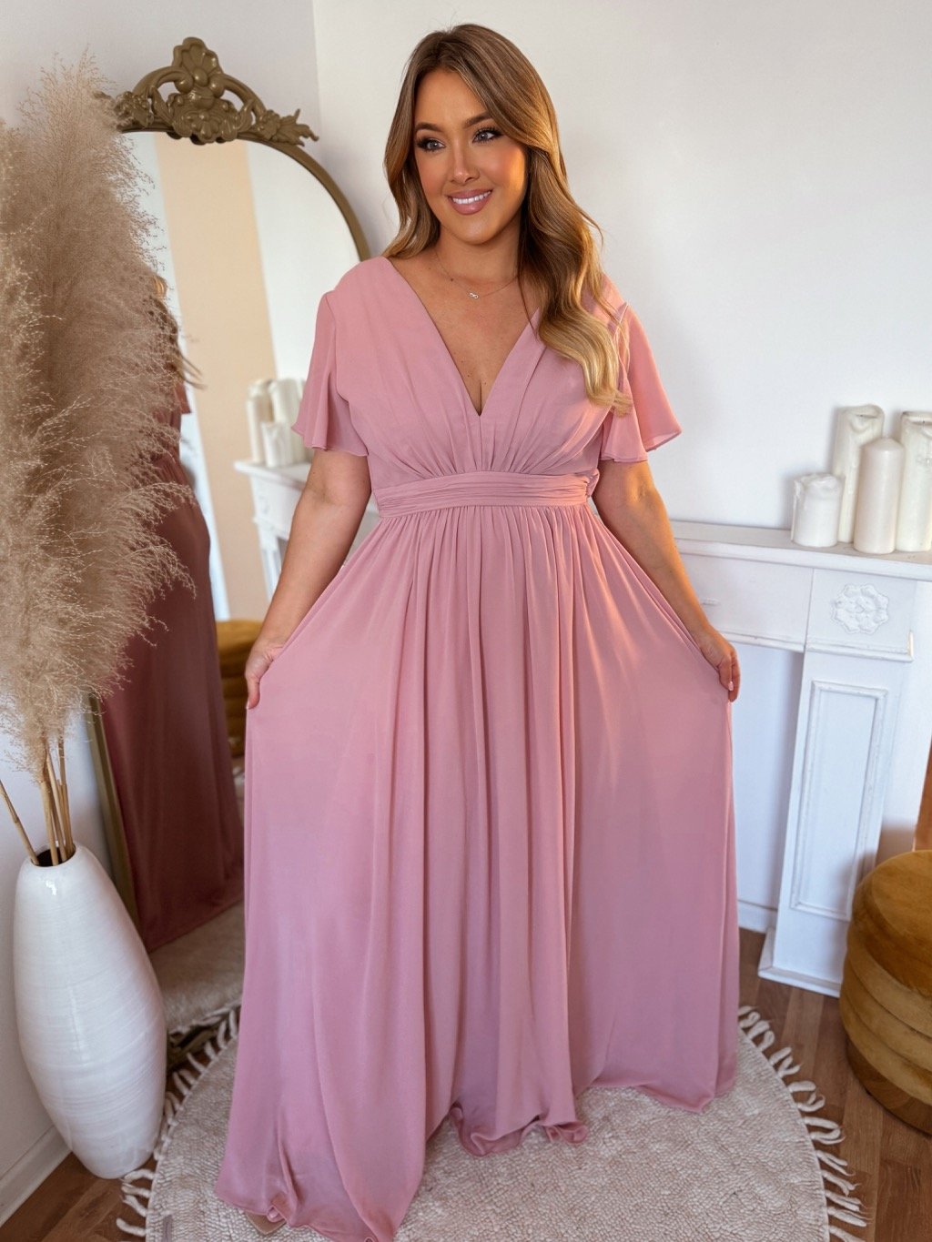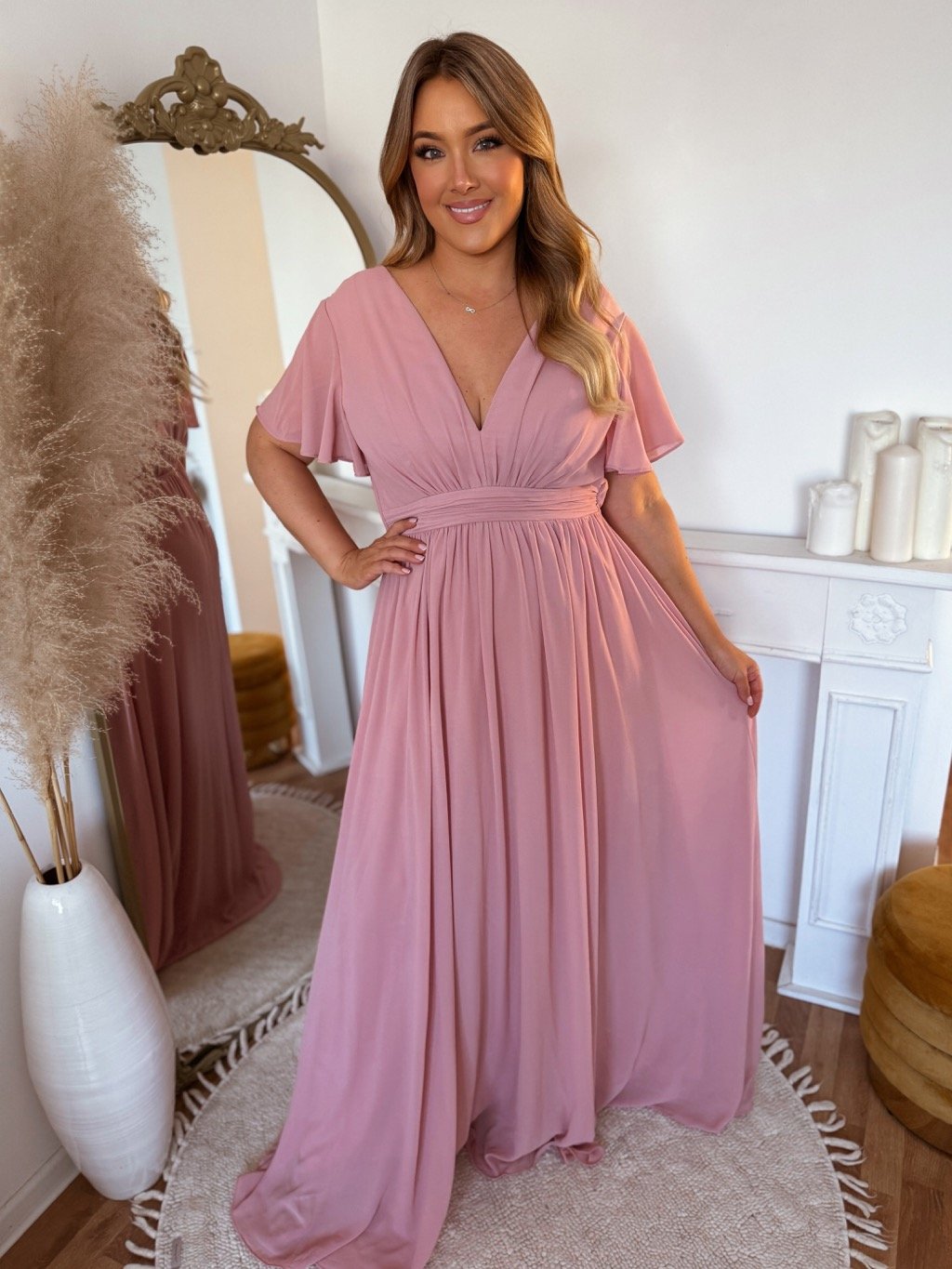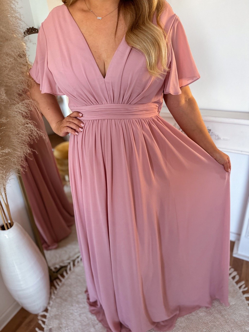 Dlhé spoločenské šaty s krátkym rukávom majú elastickú gumičku v páse a voľnú sukňu. Modelka meria 168 cm a má na sebe veľkosť XL (42).