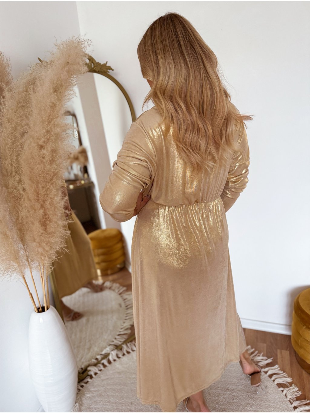 Elegantní a stylové šaty s dlouhými rukávy, hlubokým výstřihem a elastickým pasem. Tyto šaty ve fitted střihu se skvěle hodí na slavnostní příležitosti, plesy nebo večírky. Zlatá metalická barva dodává šatům luxusní vzhled a pohodlný střih zajišťuje pohodlí po celou dobu nošení. Pro zvýraznění pasu můžete šaty doplnit páskem. Modelka měří 168 cm a má na sobě velikost XL/XXL.