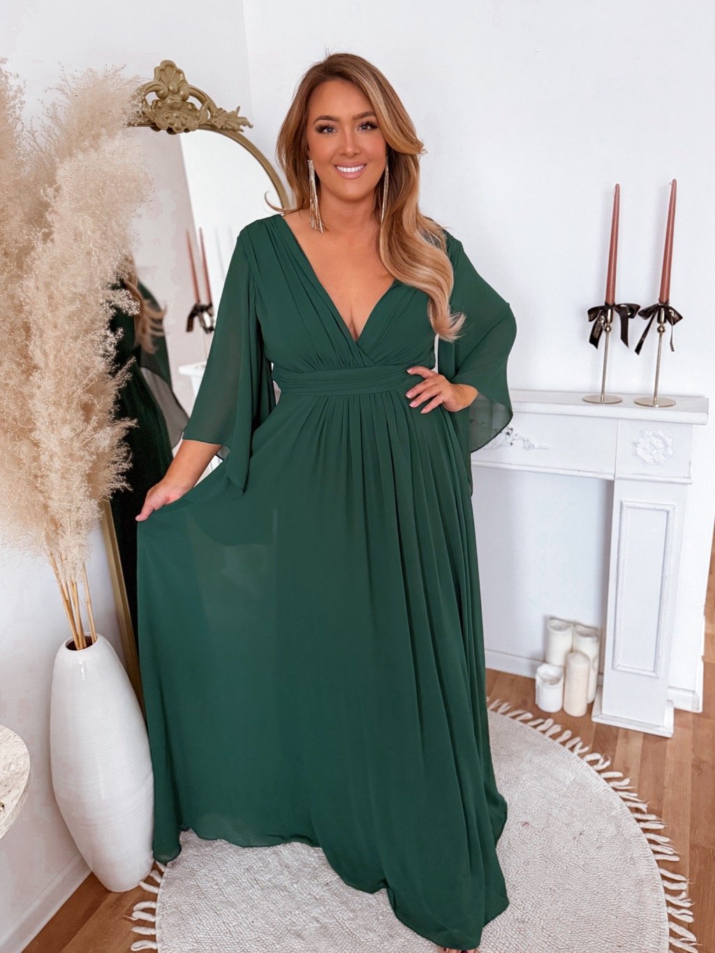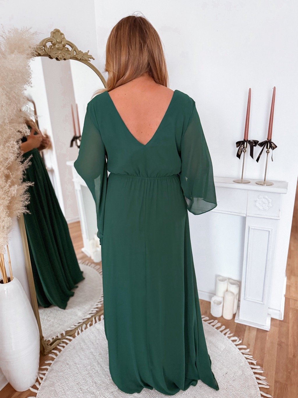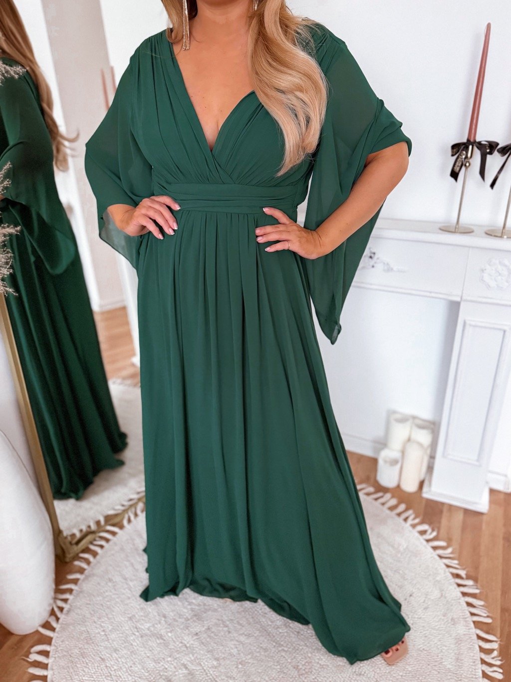 Dlouhé společenské levandulově fialové šaty s hlubokým výstřihem a dramatickými rukávy. Šaty pro služky mají v pase ze zadní strany všitou gumu. Sukně je zcela volná. Modelka je 168 cm vysoká a má na sobě velikost XL (42).