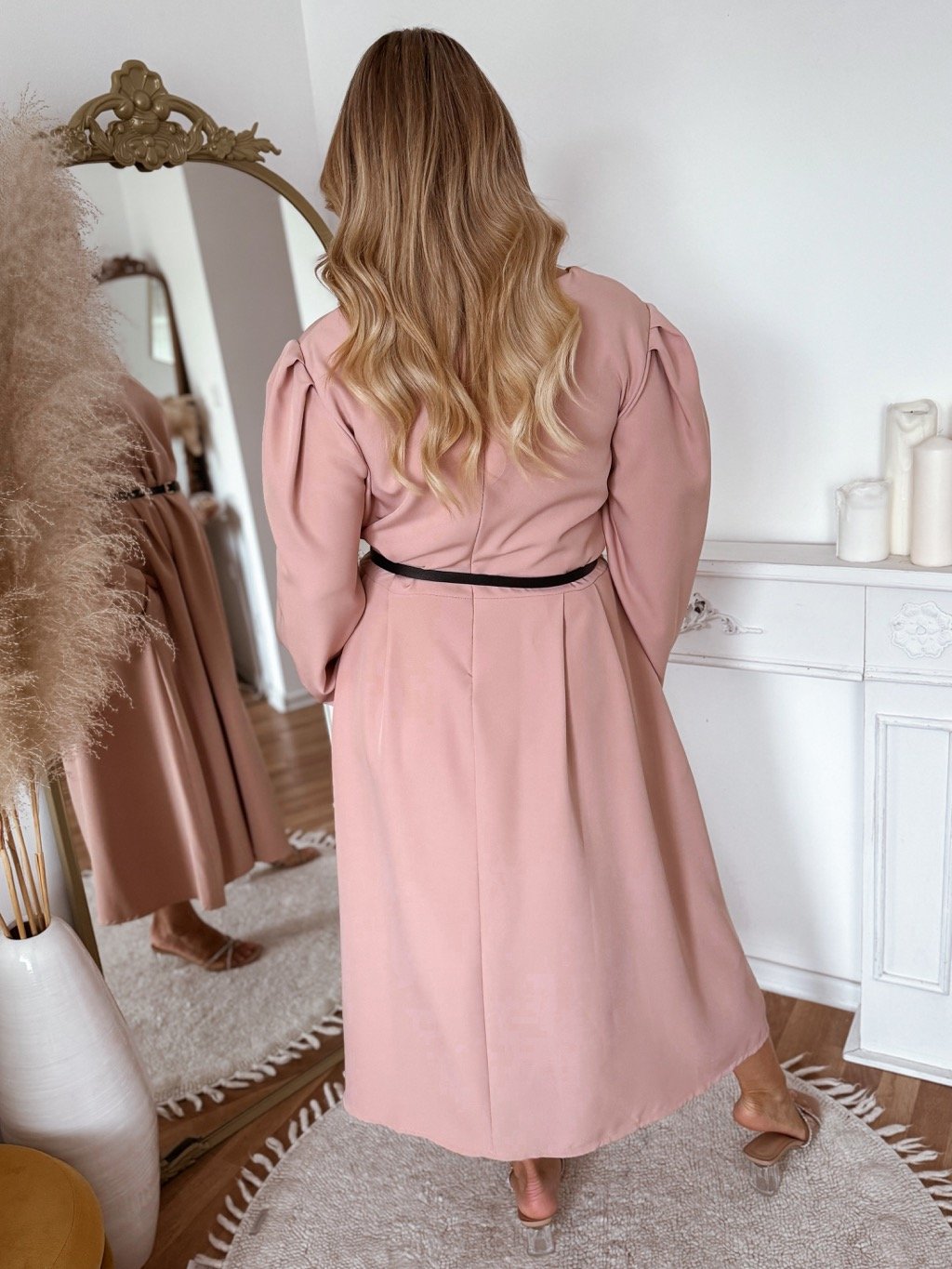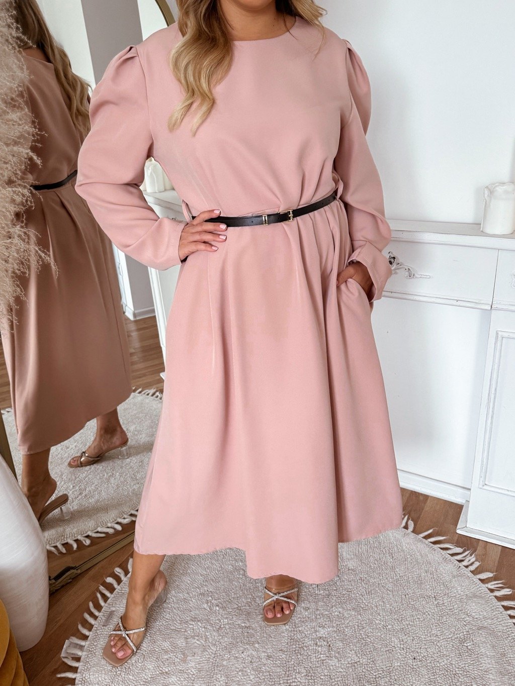 Midi šaty pro plnoštíhlé s dlouhým rukávem, který je nabraný na ramenou. Šaty mají volný střih, stahují se opaskem v pase, mají kapsy. Šaty jsou vhodné pro velikosti XL- 4XL. Modelka měří 168 cm a má na sobě univerzální velikost.