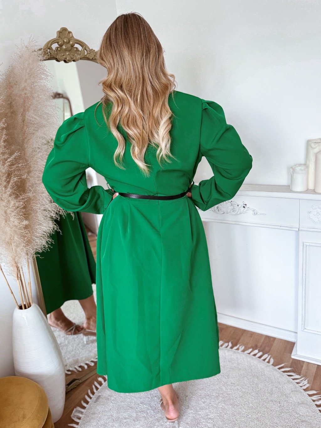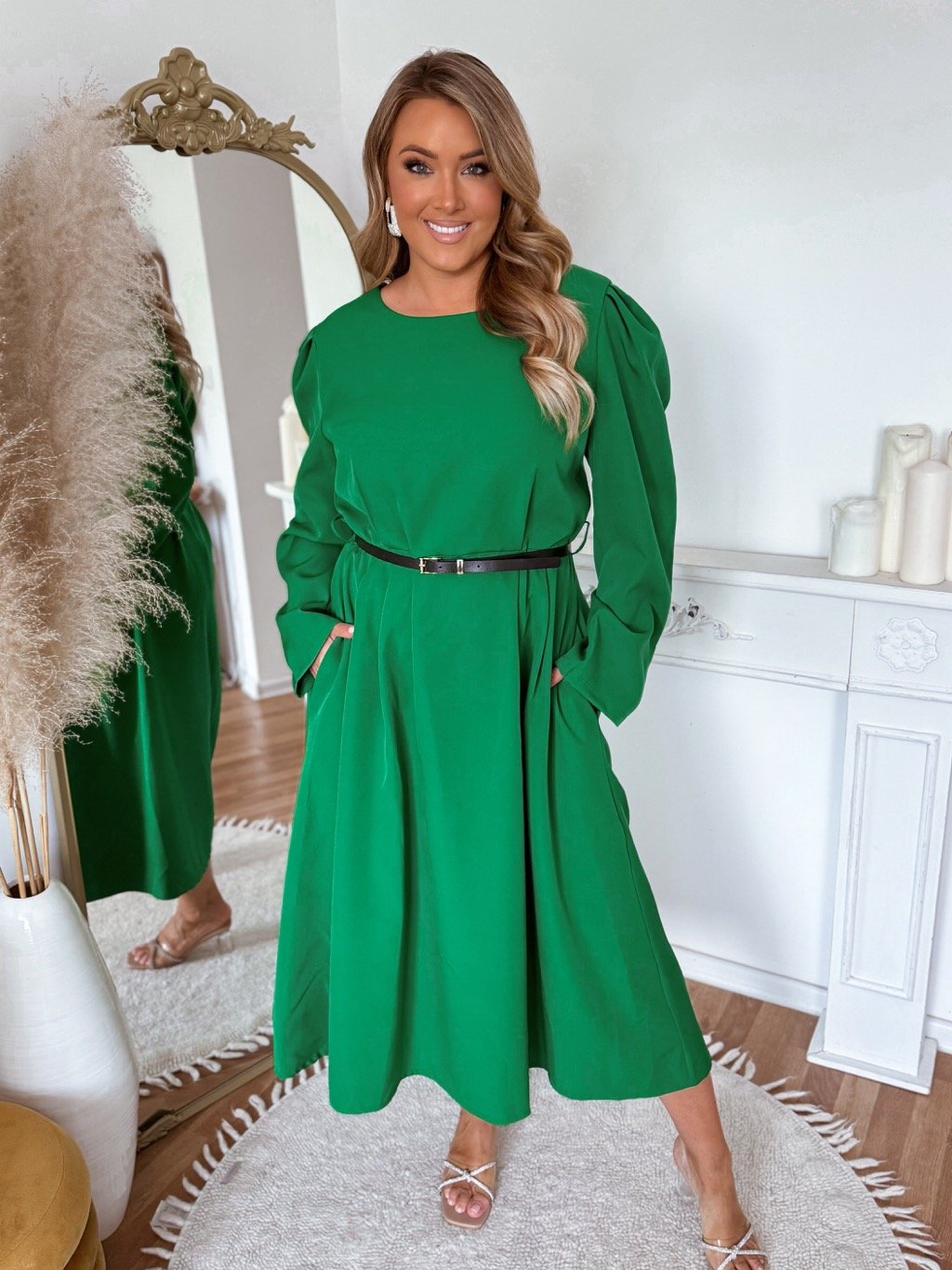 Midi šaty pro plnoštíhlé s dlouhým rukávem, který je nabraný na ramenou. Šaty mají volný střih, stahují se opaskem v pase, mají kapsy. Šaty jsou vhodné pro velikosti XL- 4XL. Modelka měří 168 cm a má na sobě univerzální velikost.