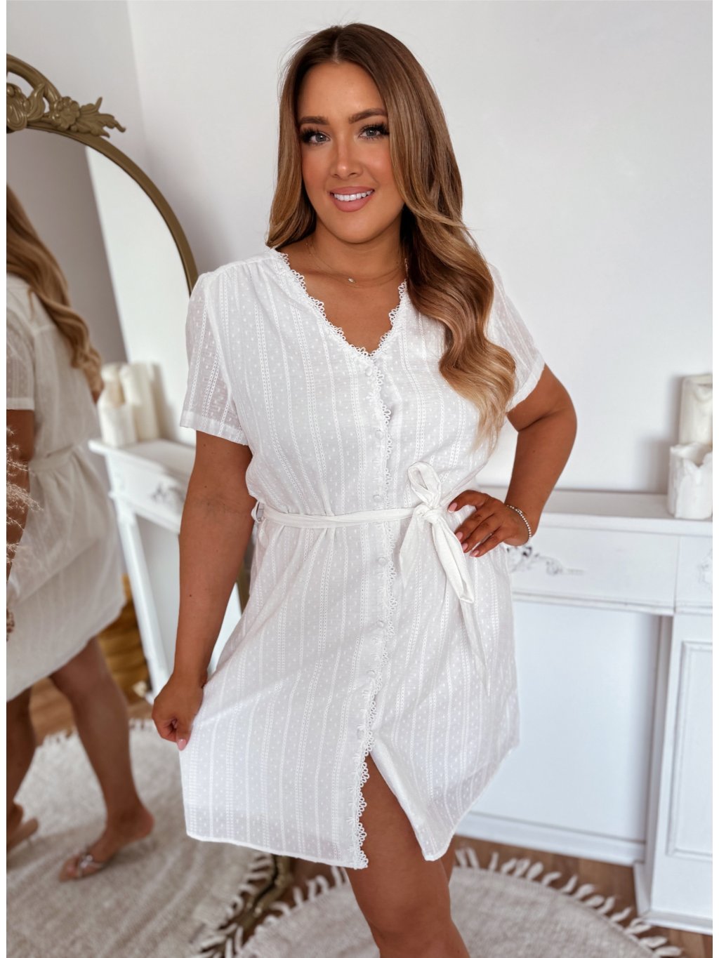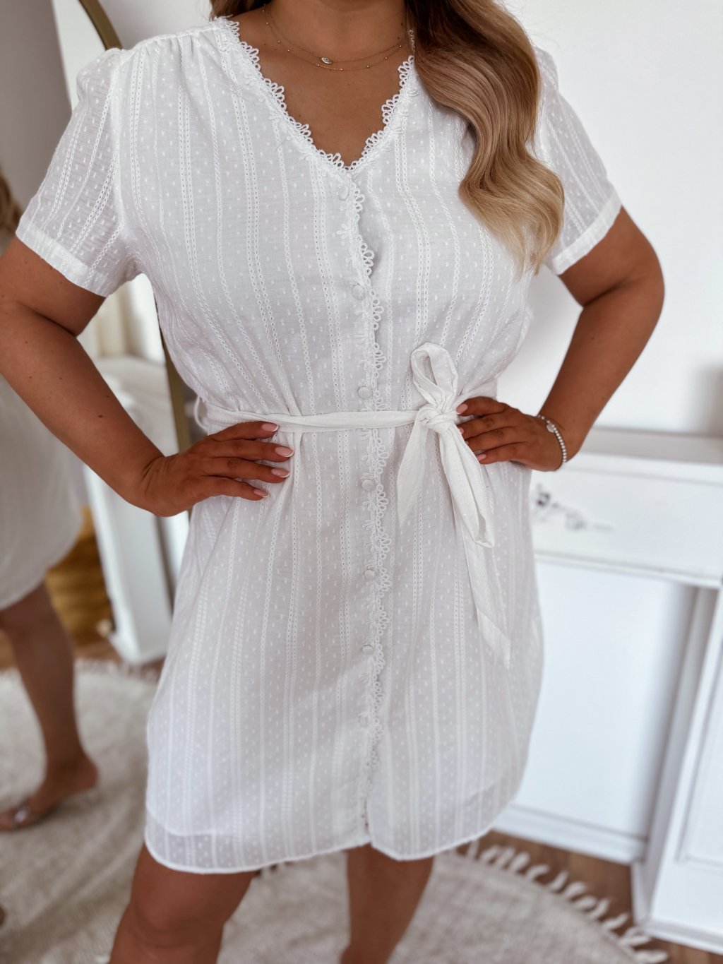 Krátké košilové šaty s krajkou mají volnější střih a v pase jsou stažené páskem. Šaty jsou mírně eleastické. Modelka měří 168 cm a má na sobě velikost XL.