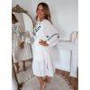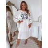Bílé šaty mají volný střih a v pase jsou přepásané. Modelka měří 168 cm a má na sobě velikost L/XL.