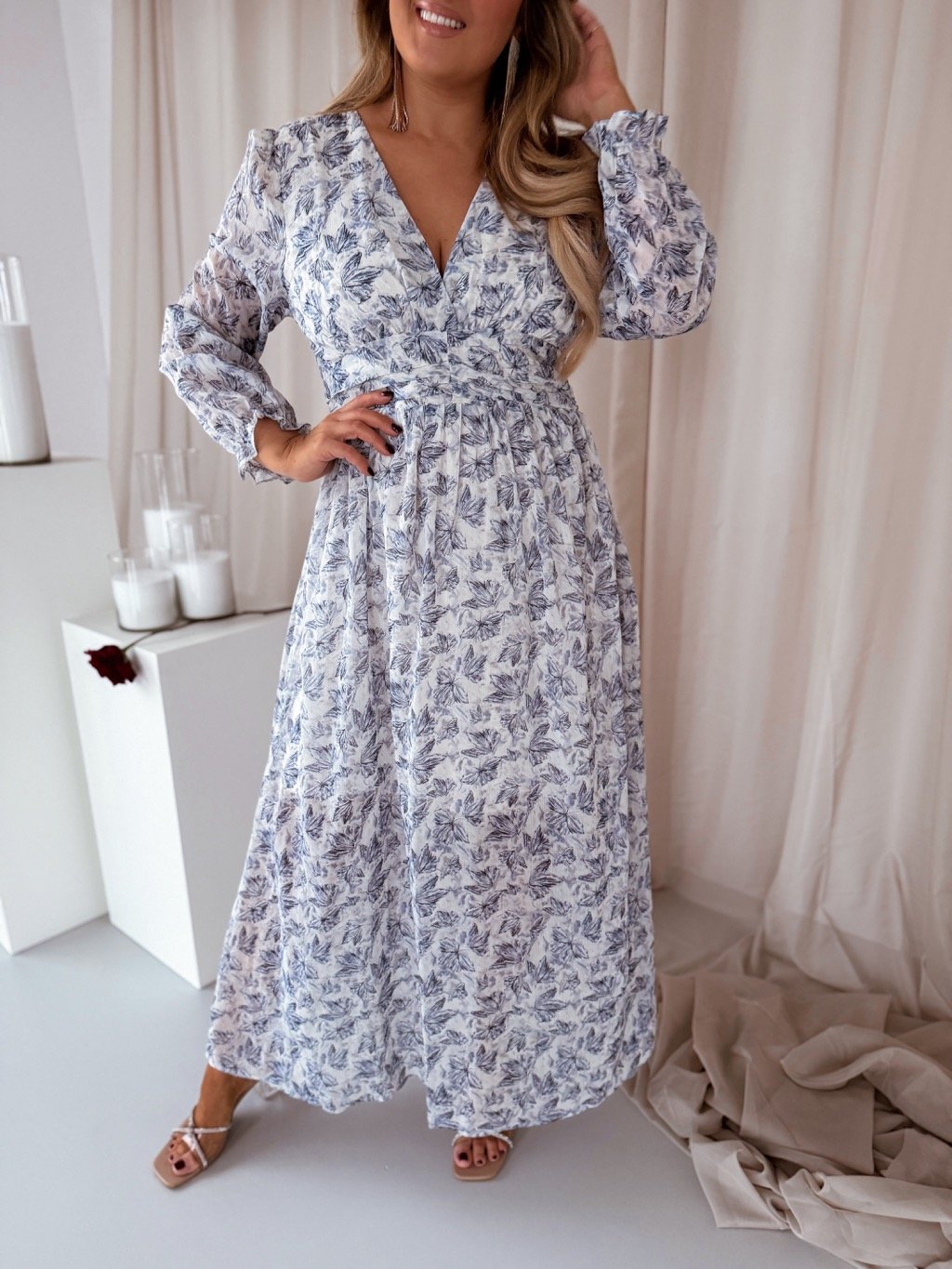 Dlouhé šaty s dlouhým rukávem a výstřihem do V mají v pase gumu. Modelka měří 168 cm a má na sobě velikost XL.