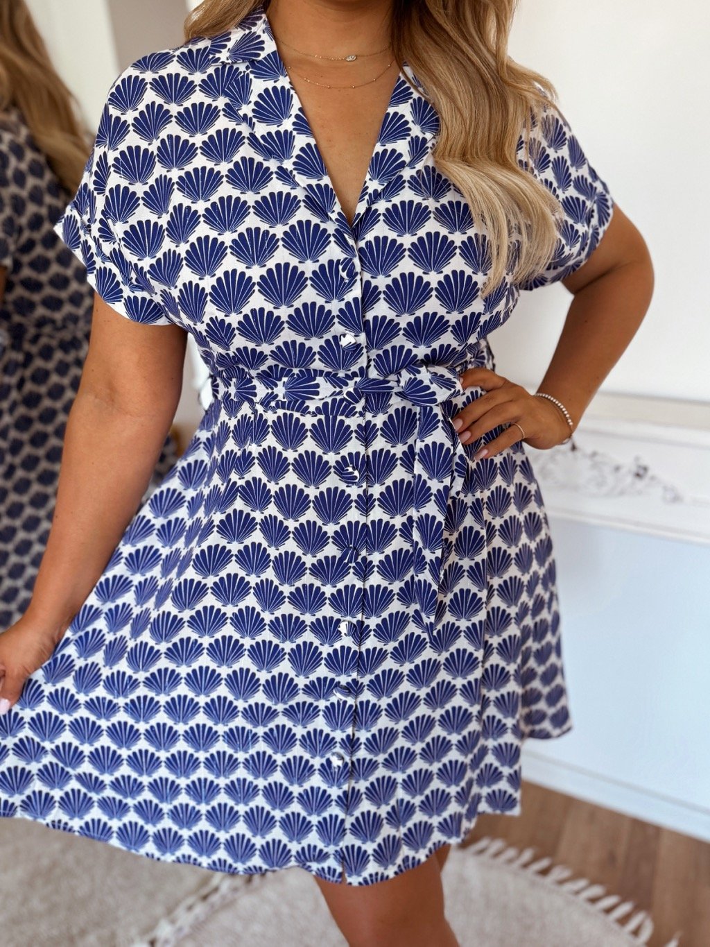 Krátké áčkové košilové šaty s límečkem a sukní, která je zcela volná. Modelka měří 168 cm a má na sobě velikost XL.