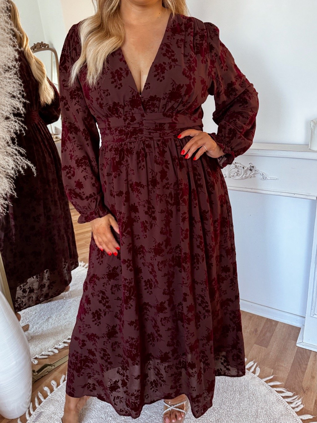 Dlouhé bordó společenské šaty pro plnoštíhlé s dlouhým rukávem a výstřihem, šaty mají gumičku v pase, která krásně formuje siluetu. Modelka měří 168 cm a má na sobě velikost XL.