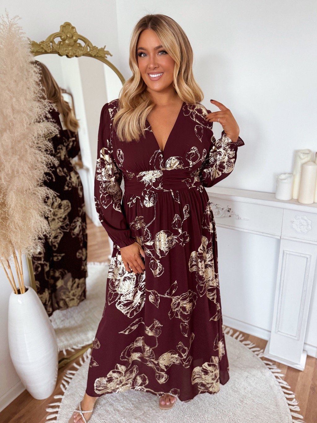 Tyto elegantní bordó maxi šaty se zlatým květinovým vzorem jsou ideální volbou pro společenské události, oslavy i romantické večeře. Hluboký výstřih do V a zvýrazněný pas s gumičkou krásně tvarují postavu, zatímco dlouhé rukávy dodávají šatům jemnou eleganci. Lehký splývavý složení materiálu se příjemně nosí a vytváří ženský, půvabný vzhled. Modelka měří 168 cm a má na sobě velikost XL.