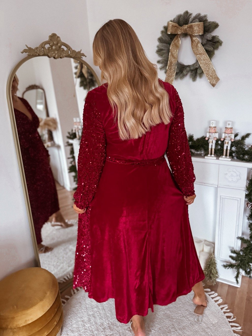 Dlouhé elegantní šaty ve flitrovaně-sametové kombinaci mají gumičku v pase a volnou sukni. Šaty jsou ze zadní strany sametové a bez flitrů. Modelka měří 168 cm a má na sobě velikost L/XL.