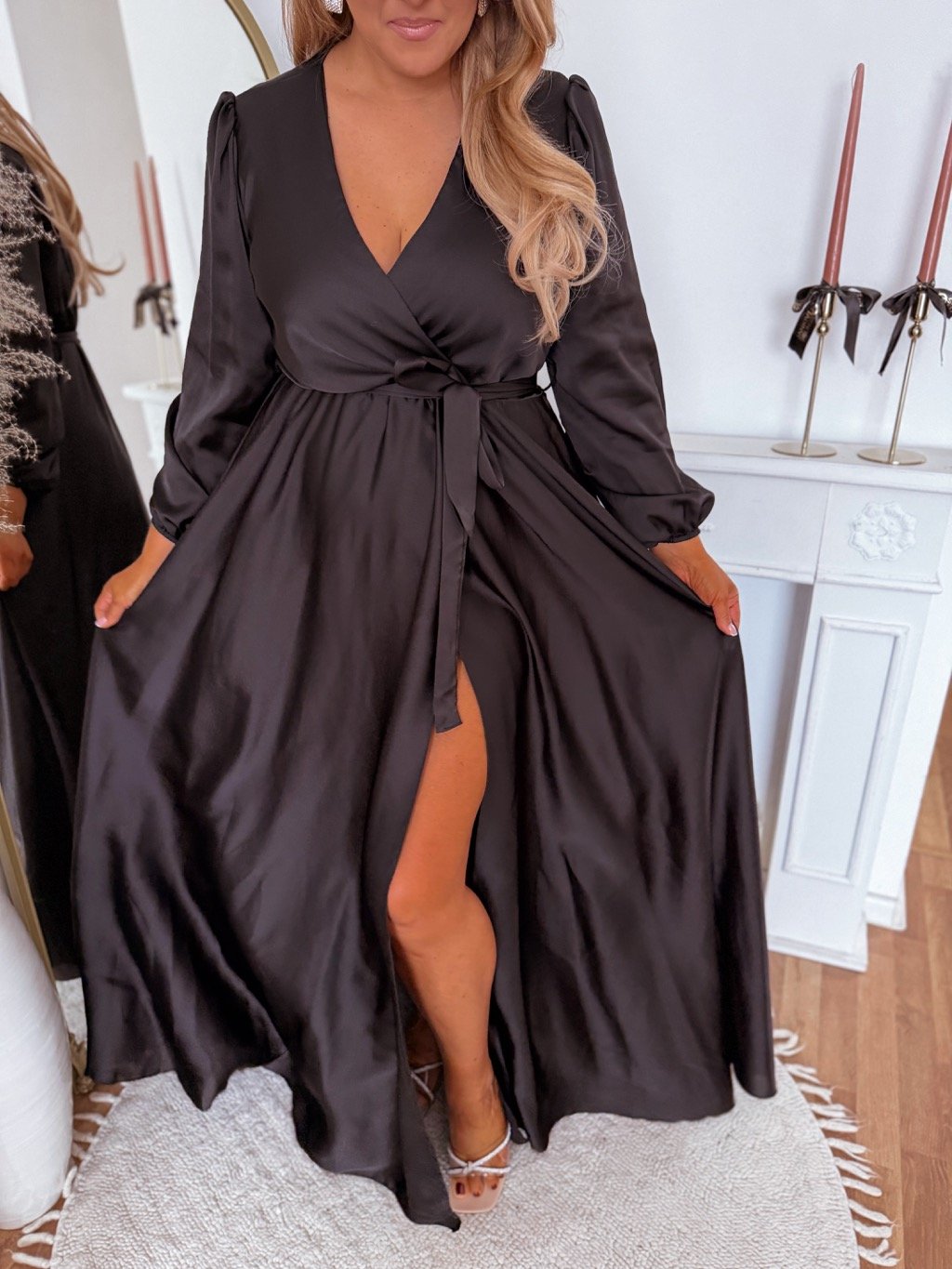 Dlouhé saténové společenské šaty s elastickou gumičkou v pase a maxi sukníjsou ideální volbou pro společenské události, oslavy, svatby nebo jiné speciální příležitosti. Modelka měří 168 cm a má na sobě velikost XL.