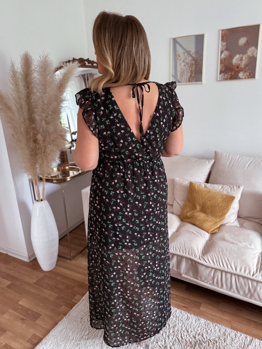 Dlouhé šaty pro plnoštíhlé s krátkým rukávem a rozparkem. Šaty mají v pase gumičku. Modelka měří 168 cm a má na sobě velikost XL.