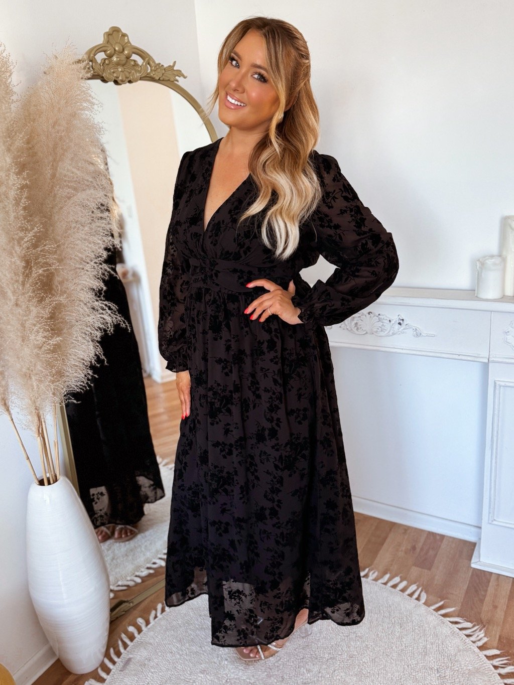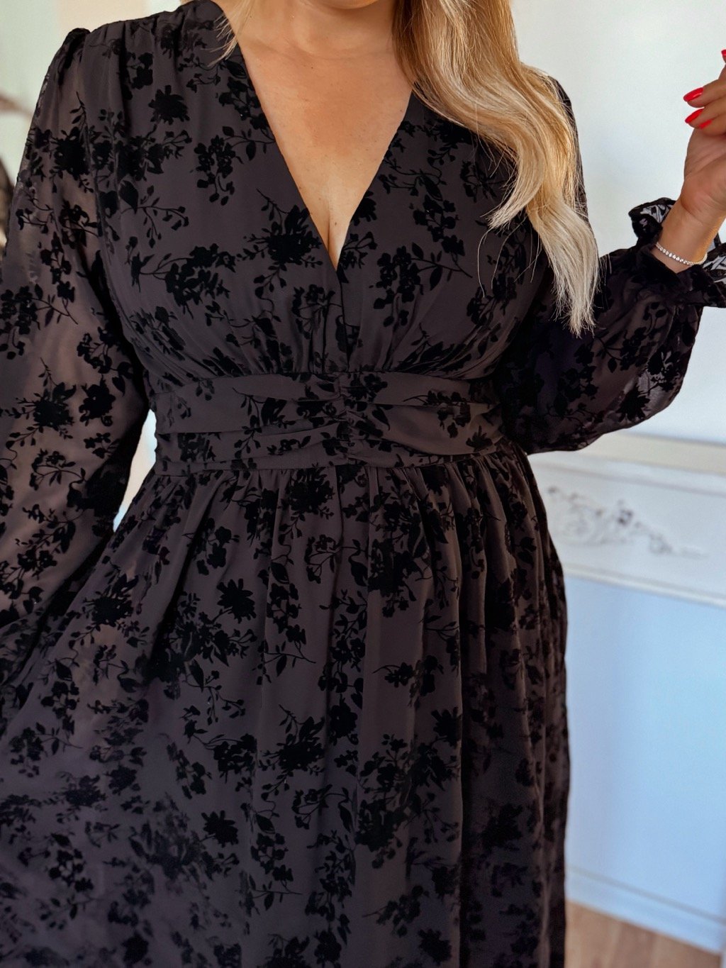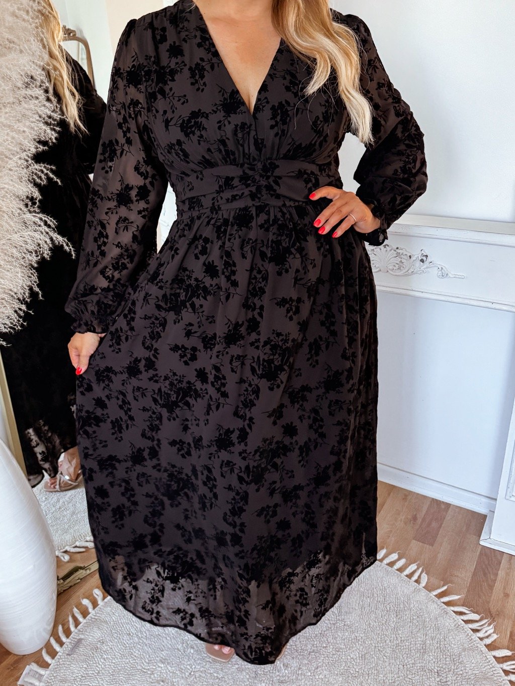 Dlouhé černé společenské šaty pro plnoštíhlé s dlouhým rukávem a výstřihem, šaty mají gumičku v pase, která krásně formuje siluetu. Modelka měří 168 cm a má na sobě velikost XL.