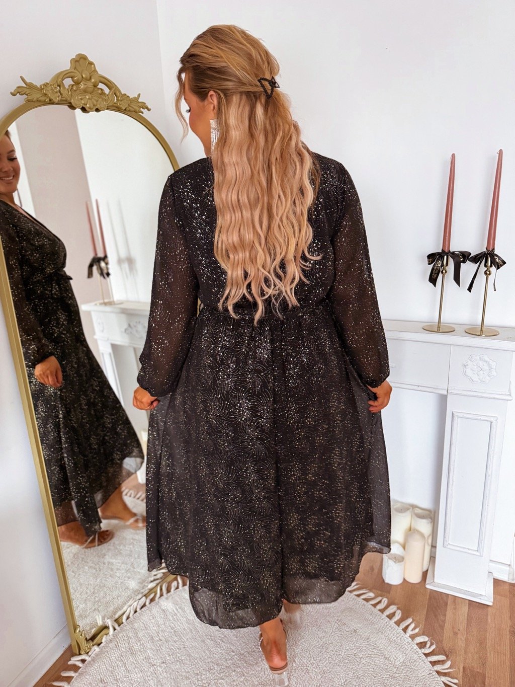 Dlouhé elegantní dámské šaty mají na látce zlatý vzor. Mají gumičku v pase. Šaty jsou od pasu dolů volné. Modelka měří 168 cm a má na sobě velikost XL/XXL.