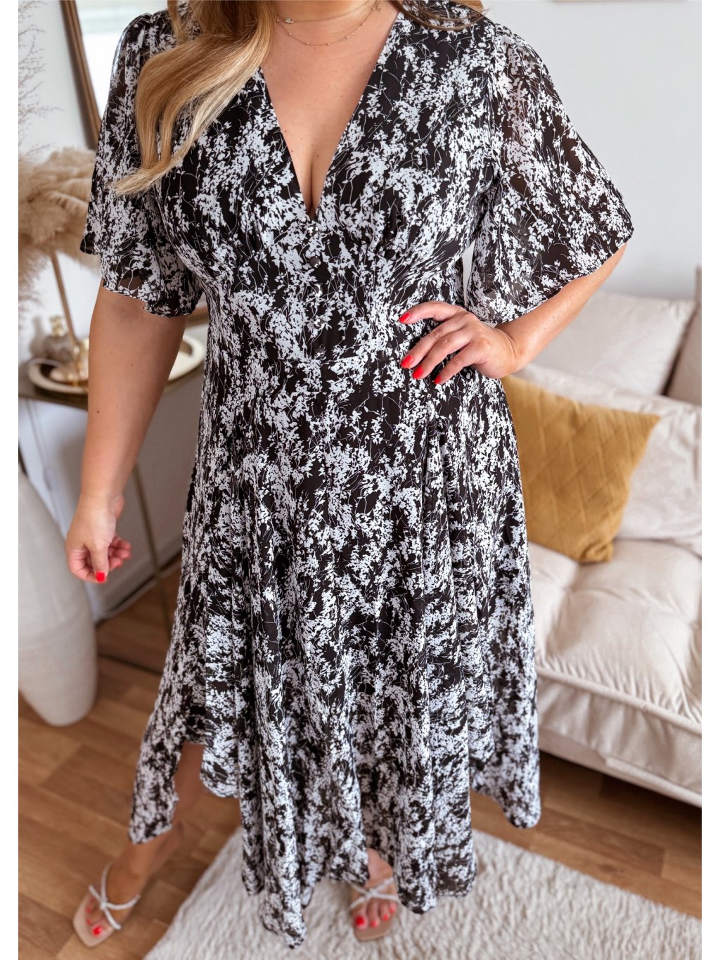 Dlouhé romantické letní šaty jsou v pase zúžené. V oblasti zadního pasu je všitá gumička, sukně má na bocích zcela volný asymetrický střih. Na hrudi jsou ozdobné knoflíky. Modelka měří 168 cm a má na sobě velikost XL.