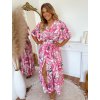 Dlouhé elegantní růžové dámské šaty pro moletky s krátkými rukávy a rozparkem. Šaty mají elastický pas a pásek. Modelka měří 168 cm a má na sobě velikost XL.