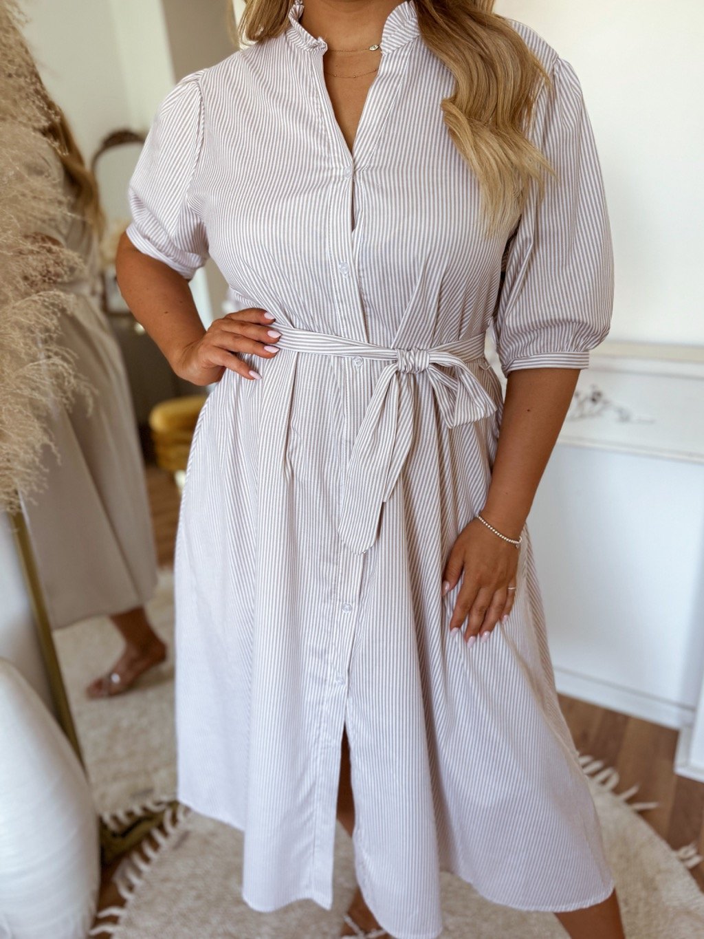 Elegantní bavlněné proužkované košilové šaty s krátkým rukávem a kapsami. Šaty mají volný střih, v pase jsou stažené páskem. Modelka měří 168 cm a má na sobě velikost XL/XXL.