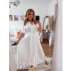 Dlouhé elegantní bílé dámské šaty pro moletky s krátkými rukávy a rozparkem. Šaty mají elastický pas a pásek. Modelka měří 168 cm a má na sobě velikost XL.