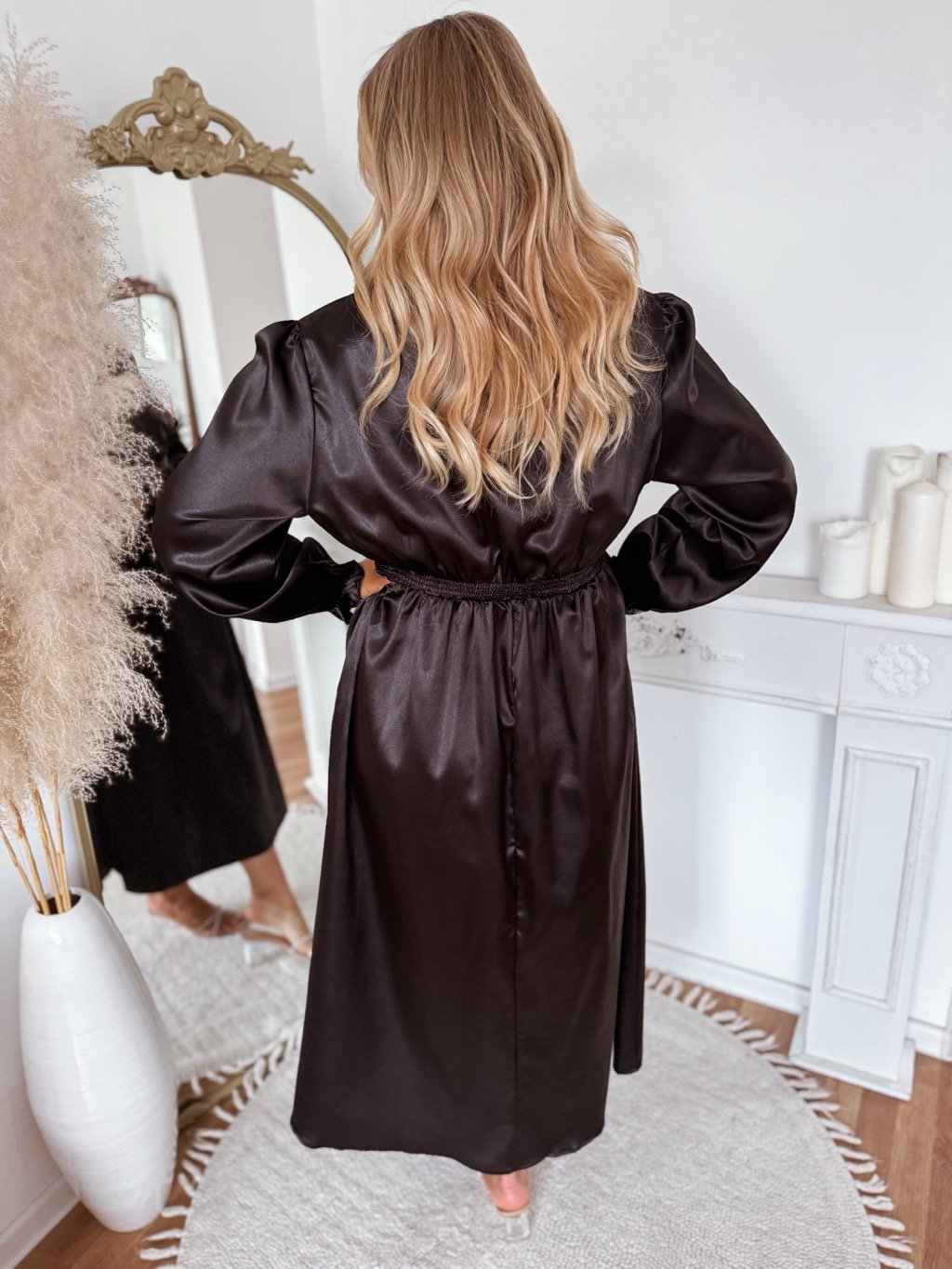 Elegantní lesklé černé šaty s dlouhým rukávem mají elastickou gumičku v pase a volnou sukni. Modelka měří 168 cm a má na sobě velikost XL.