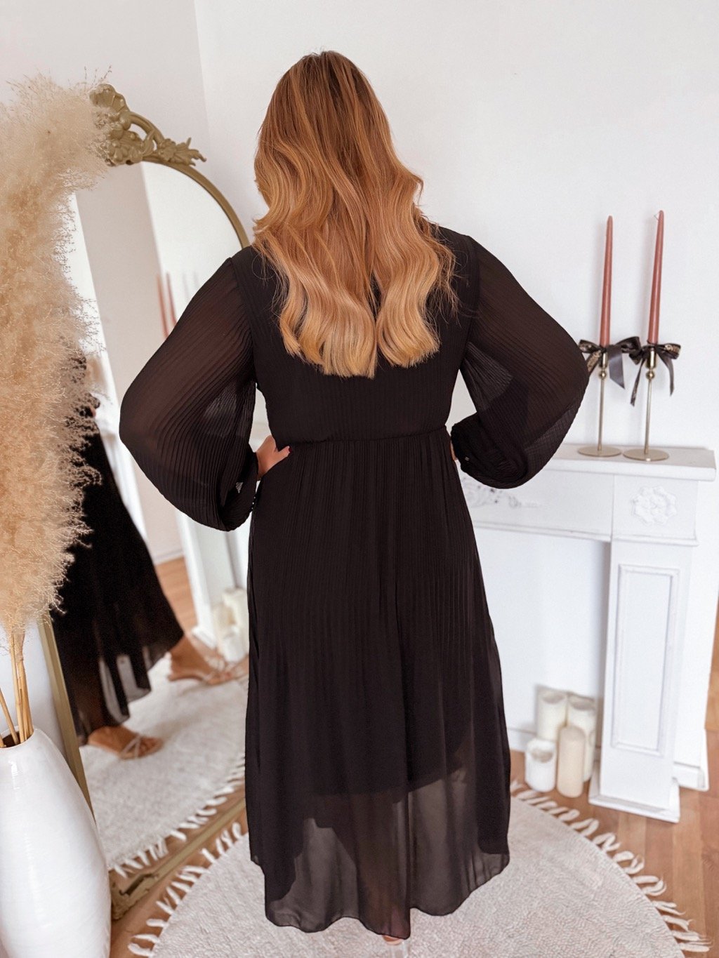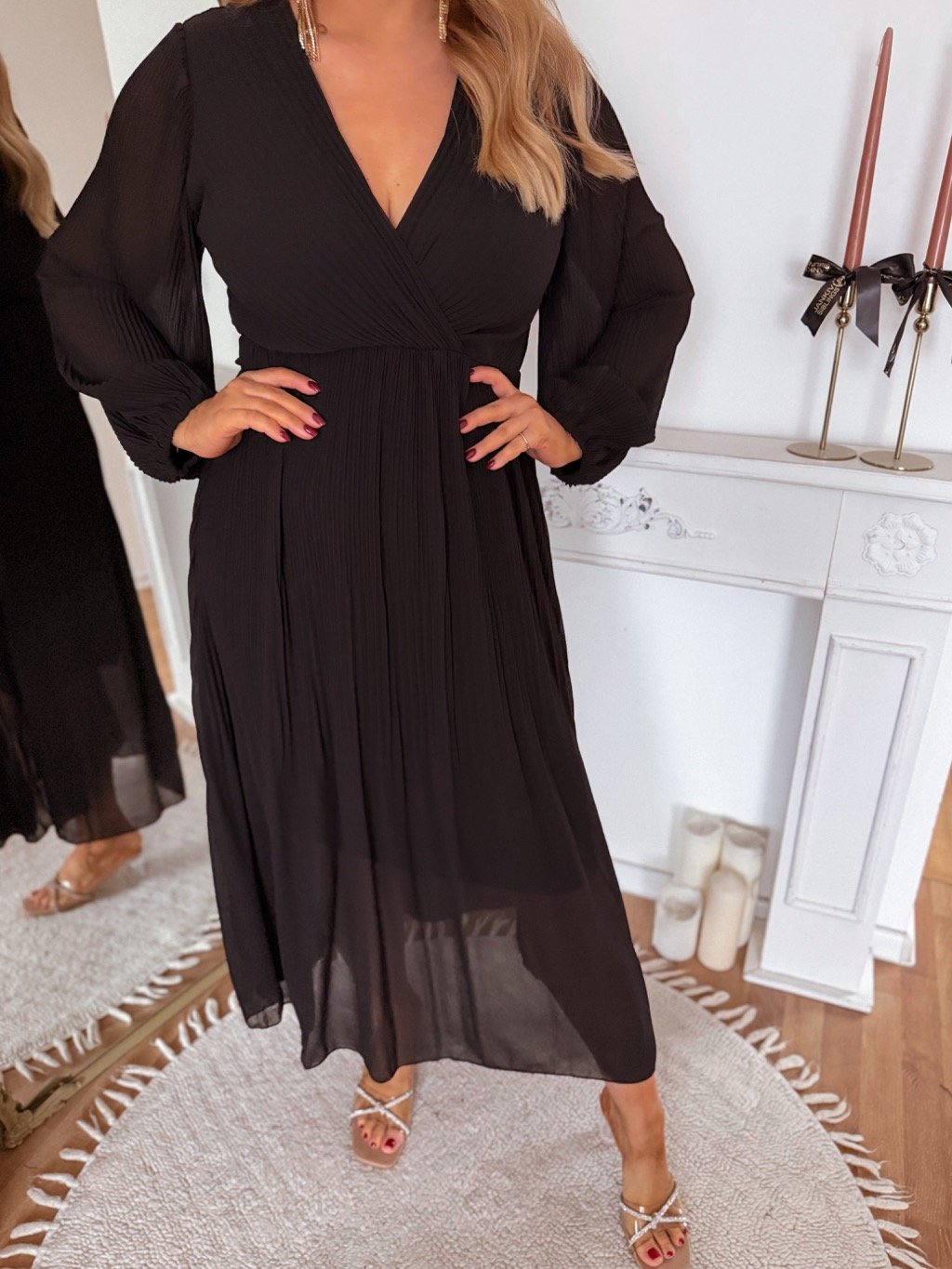 Elegantní plisované šaty s dlouhými rukávy mají volnější střih a pružný pásek v pase. Třpytivý pásek není součástí šatů, najdete ho mezi doplňky. Šaty jsou na bocích zcela volné. Modelka měří 168 cm a má na sobě velikost L/XL.