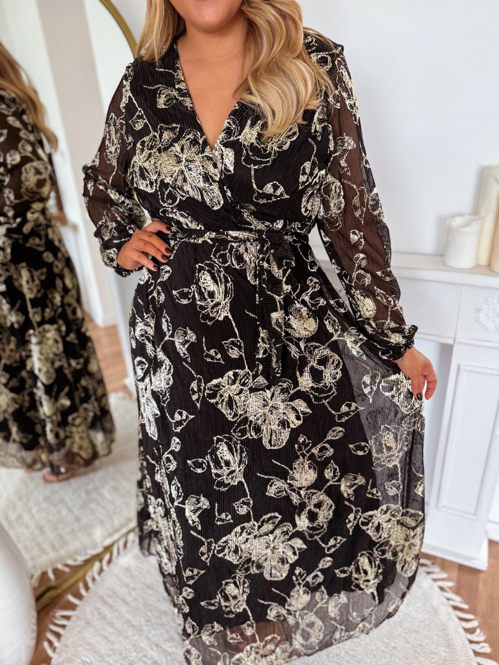 Dlouhé elegantní šaty mají gumičku v pase a volnou sukni. Rukávy jsou průhledné. Modelka měří 168 cm a má na sobě velikost L/XL.