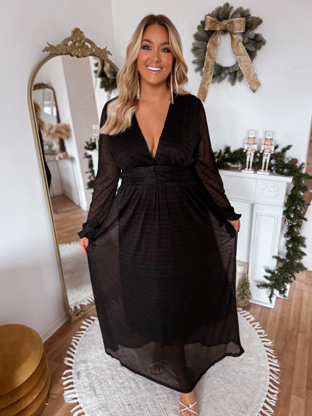 Elegantní šaty s dlouhým rukávem a hlubokým výstřihem, šaty mají elastický pas, látka je prošívaná jemně třpytivou nití. Šaty jsou elastické. Modelka měří 168 cm a má na sobě velikost XL.