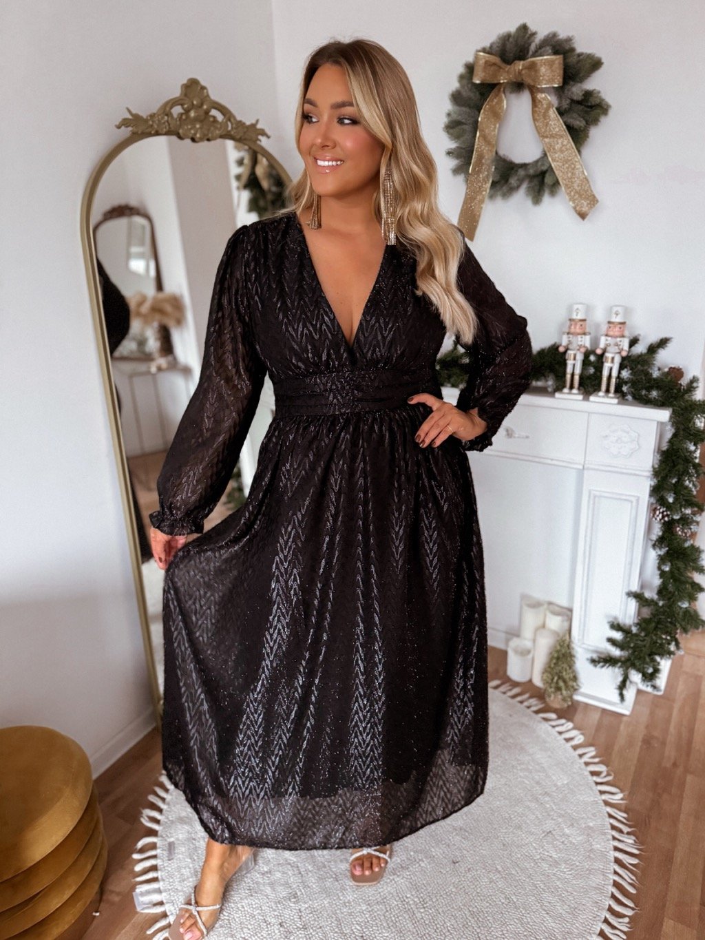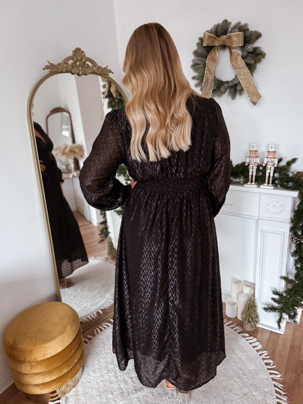 Elegantní šaty s dlouhým rukávem a hlubokým výstřihem, šaty mají elastický pas. Šaty jsou elastické. Modelka měří 168 cm a má na sobě velikost XL.