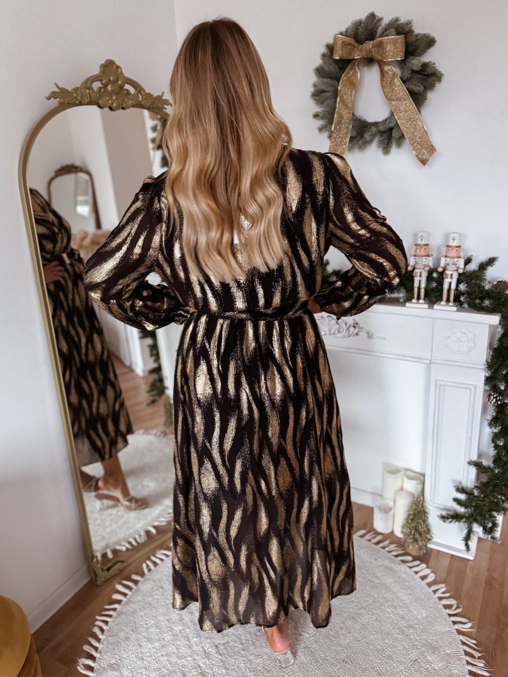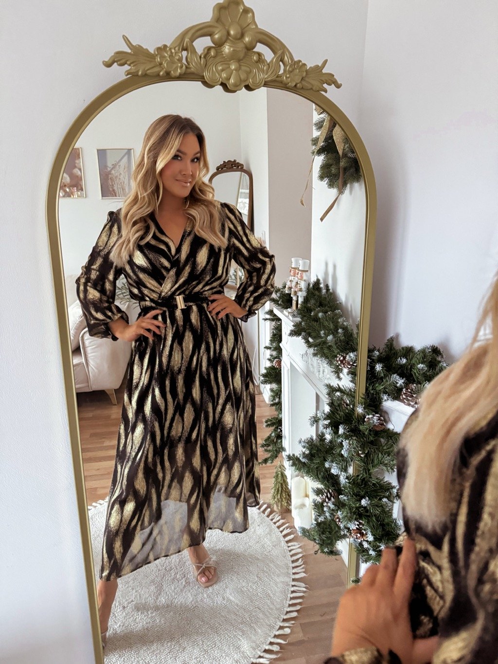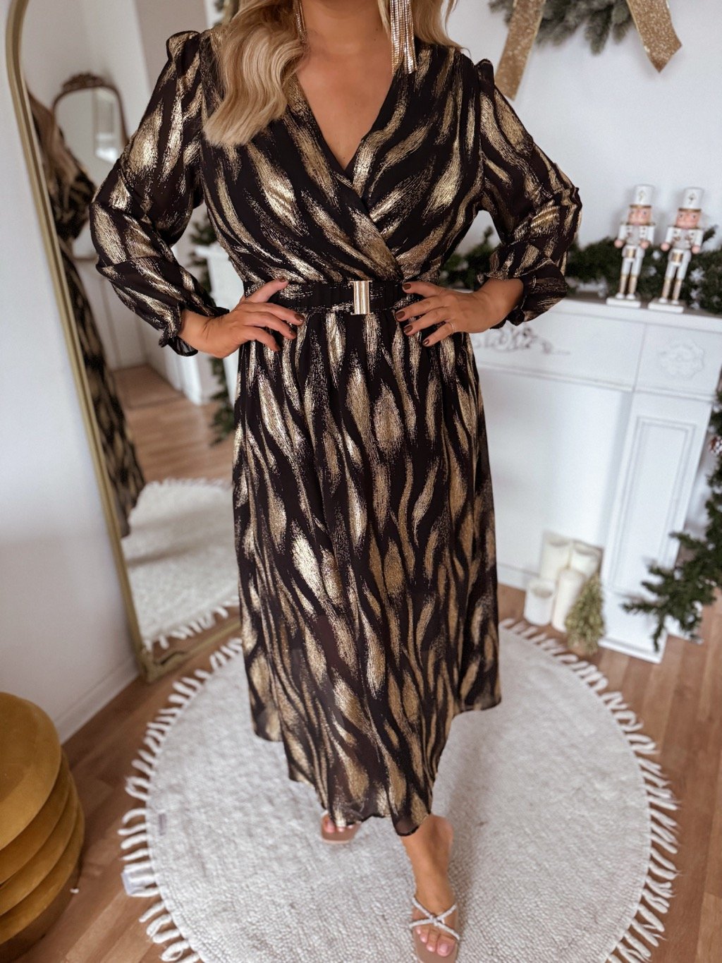 Dlouhé dámské šaty pro plnoštíhlé s dlouhým rukávem. Šaty mají elastický pas a pásek. Modelka měří 168 cm a má na sobě velikost XL.