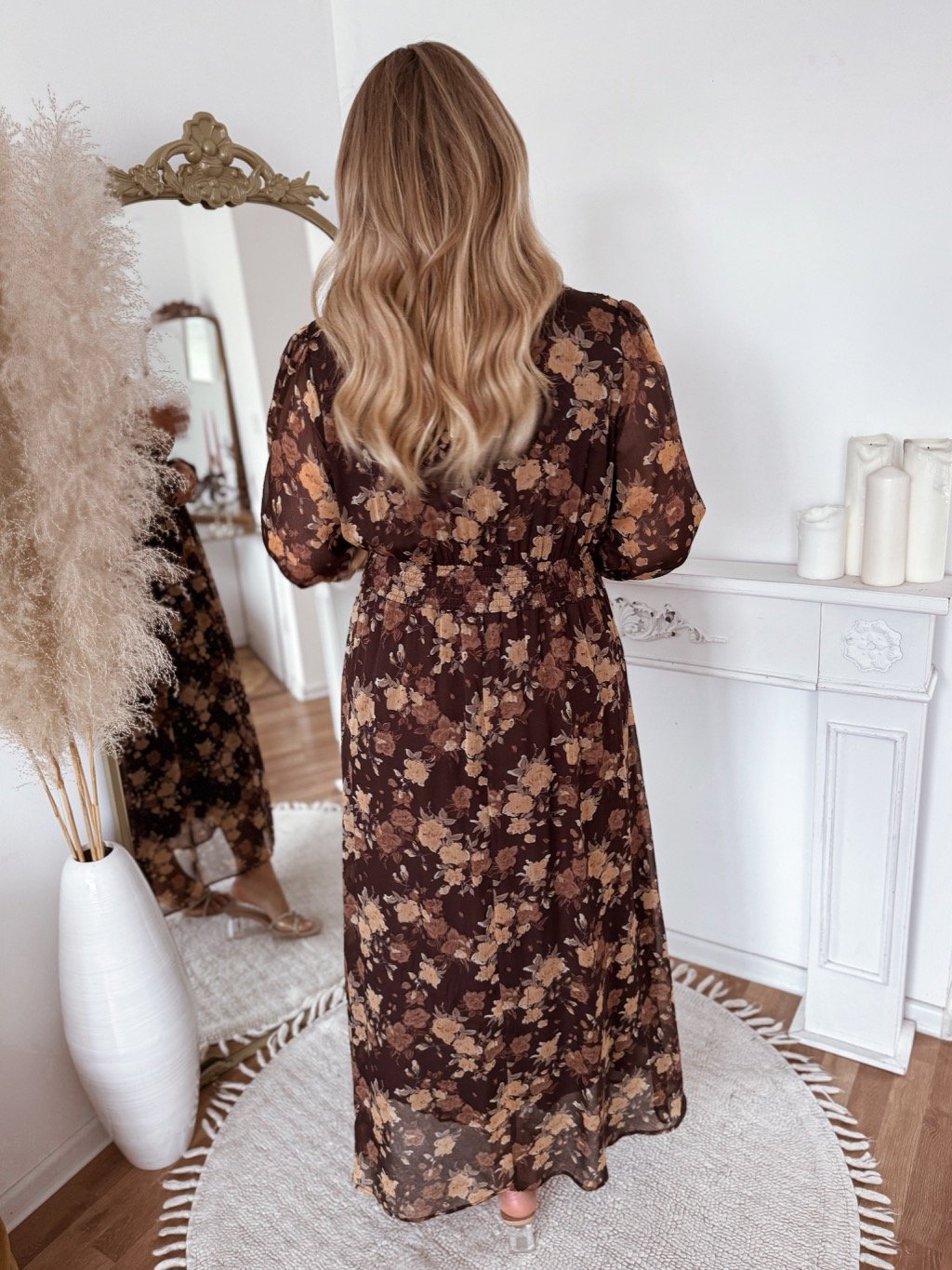 Dlouhé společenské šaty pro plnoštíhlé s dlouhým rukávem a výstřihem, šaty mají gumičku v pase, která krásně formuje siluetu. Modelka měří 168 cm a má na sobě velikost XL.