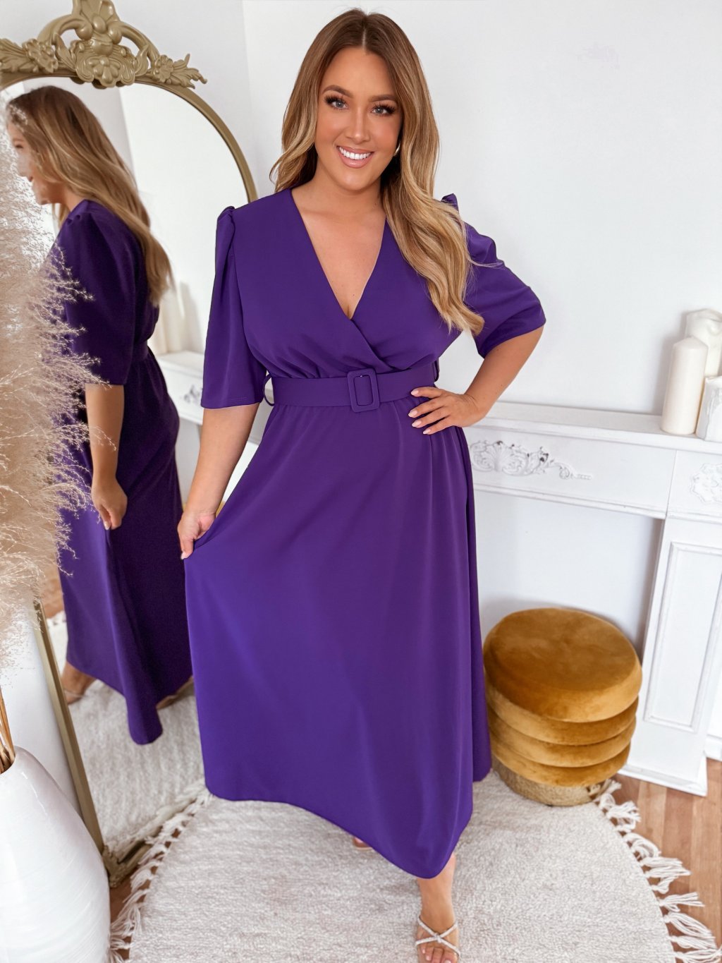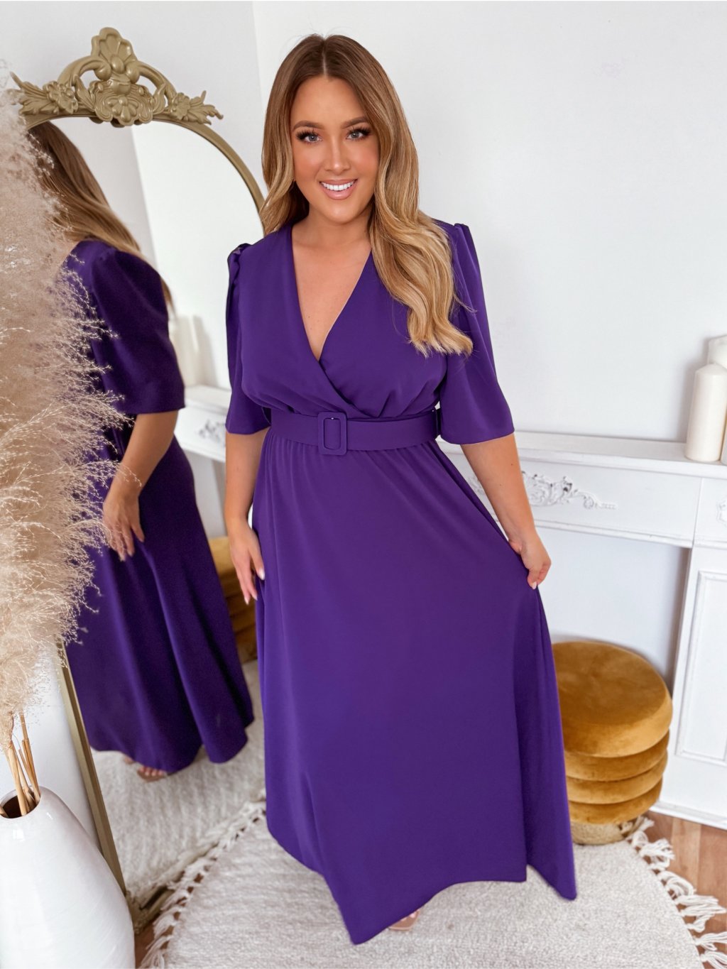 Elegantní dlouhé fialové šaty s krátkými rukávy a páskem. Šaty mají volný střih, pružný pas a jsou elastické. Šaty jsou vhodné pro velikosti XL- 4XL. Modelka měří 168 cm a má na sobě univerzální velikost.