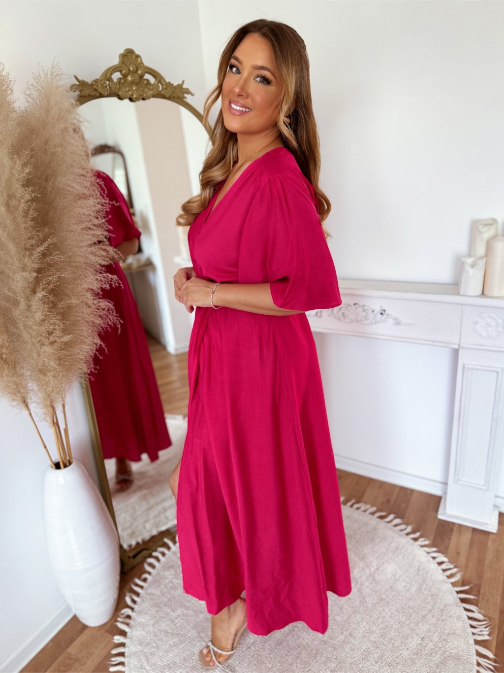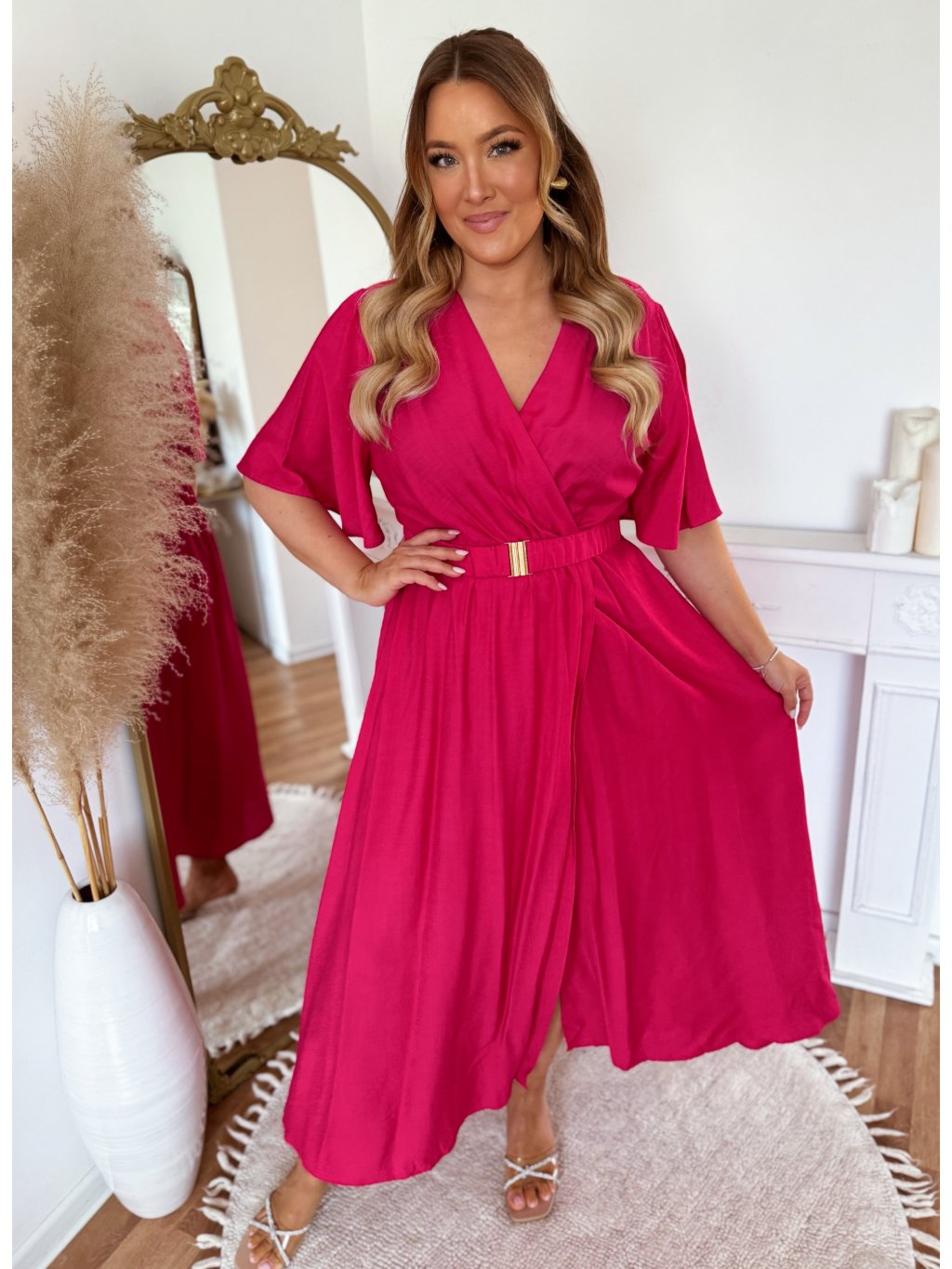 Dlouhé elegantní fuchsiové dámské šaty pro plnoštíhlé s krátkým rukávem a rozparkem. Šaty mají elastický pas a pásek. Modelka měří 168 cm a má na sobě velikost XL.
