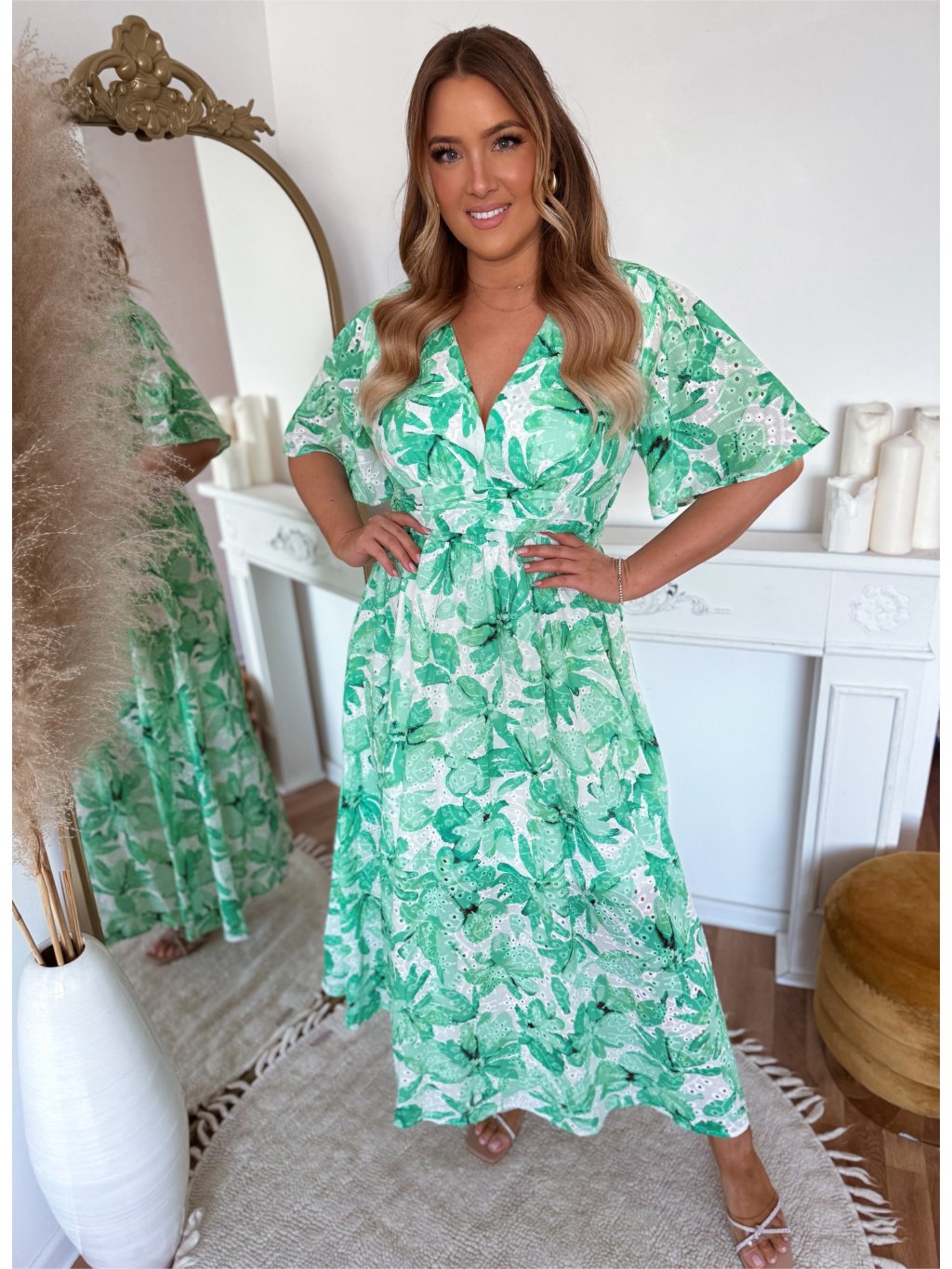 Dlouhé madeirové plus size šaty s krátkými rukávy, šaty mají vzadu elastický pásek, sukně šatů má zcela volný střih. Modelka měří 168 cm a má na sobě velikost XL.