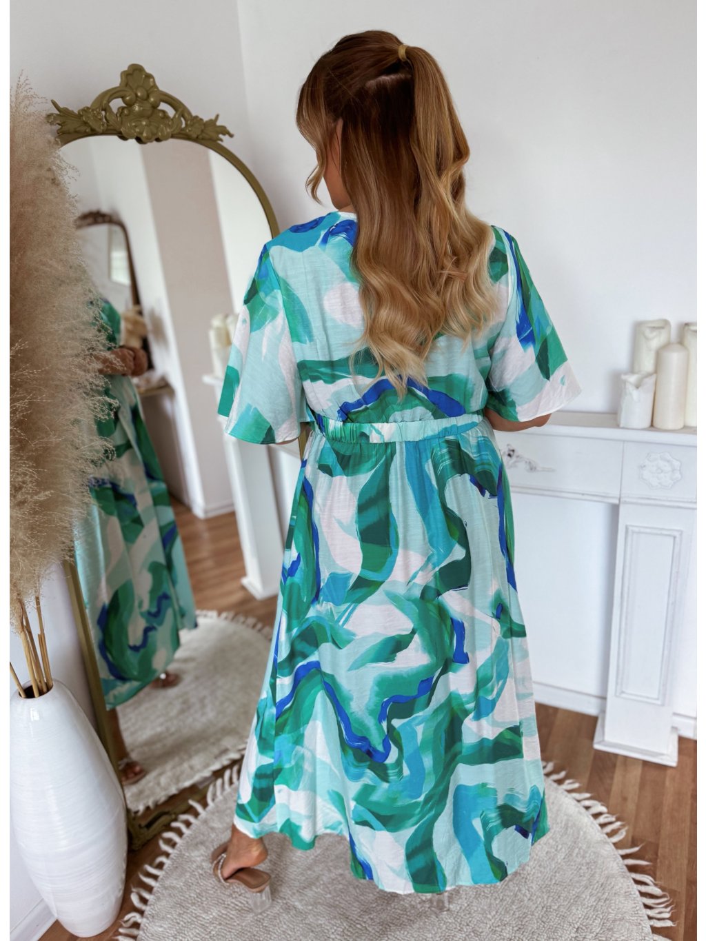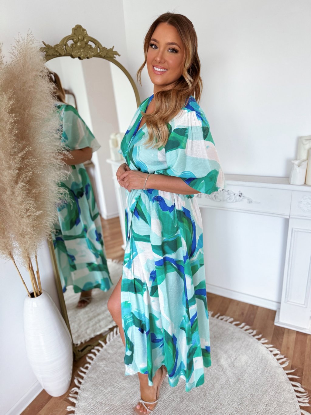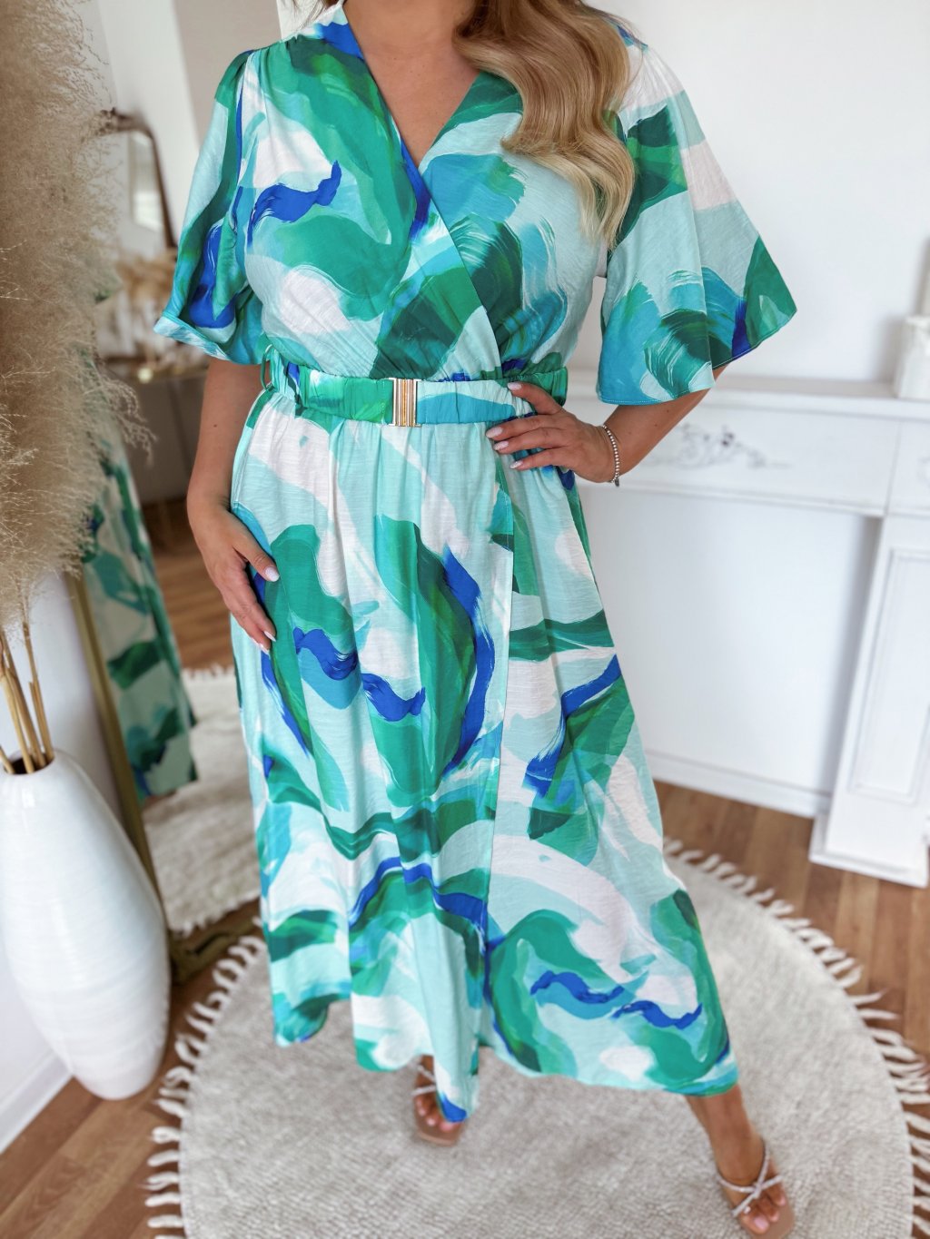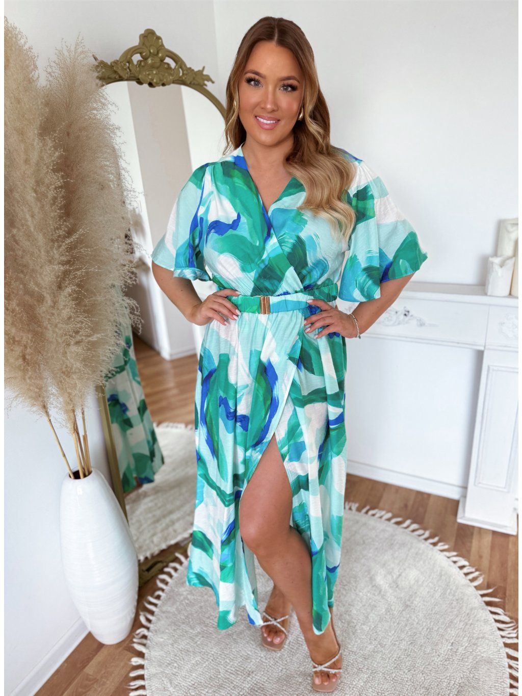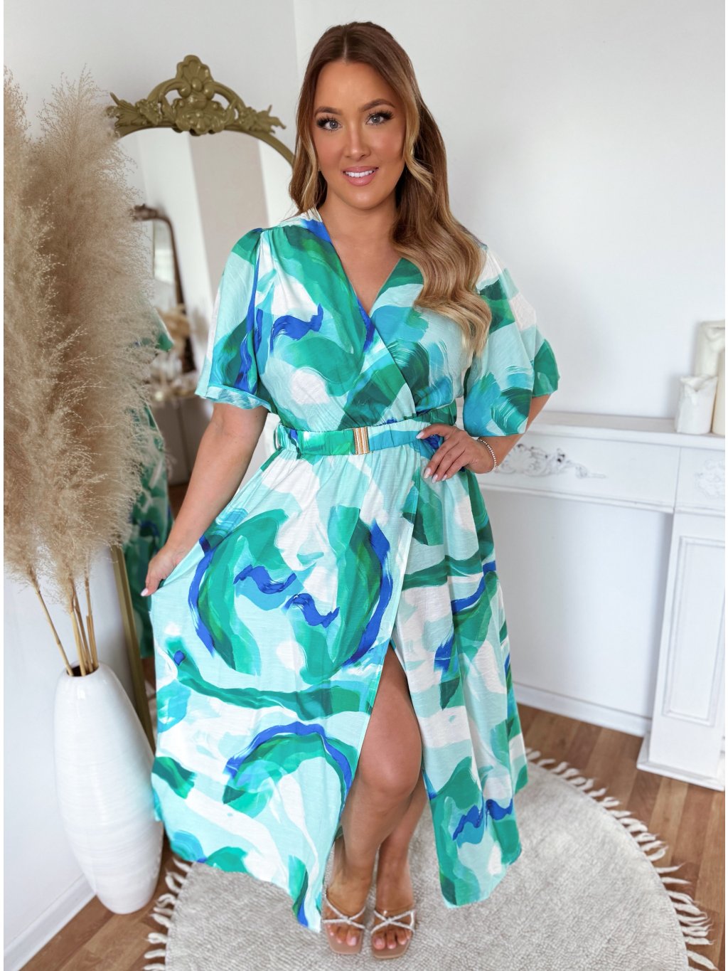 Dlouhé elegantní modro-bílé dámské šaty pro plnoštíhlé s krátkým rukávem a rozparkem. Šaty mají elastický pas a pásek. Modelka měří 168 cm a má na sobě velikost XL.