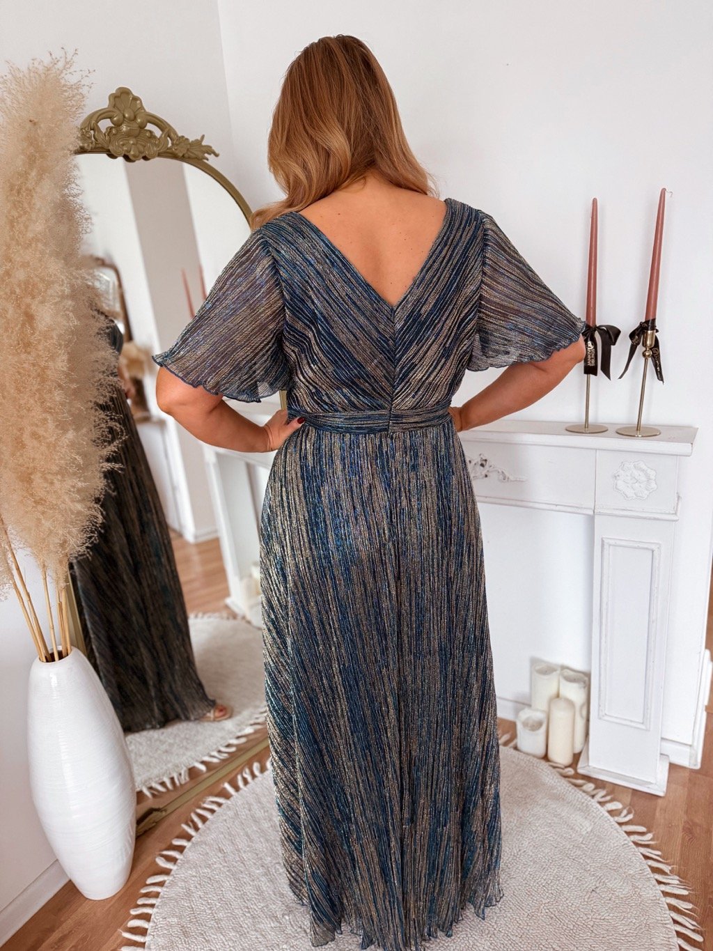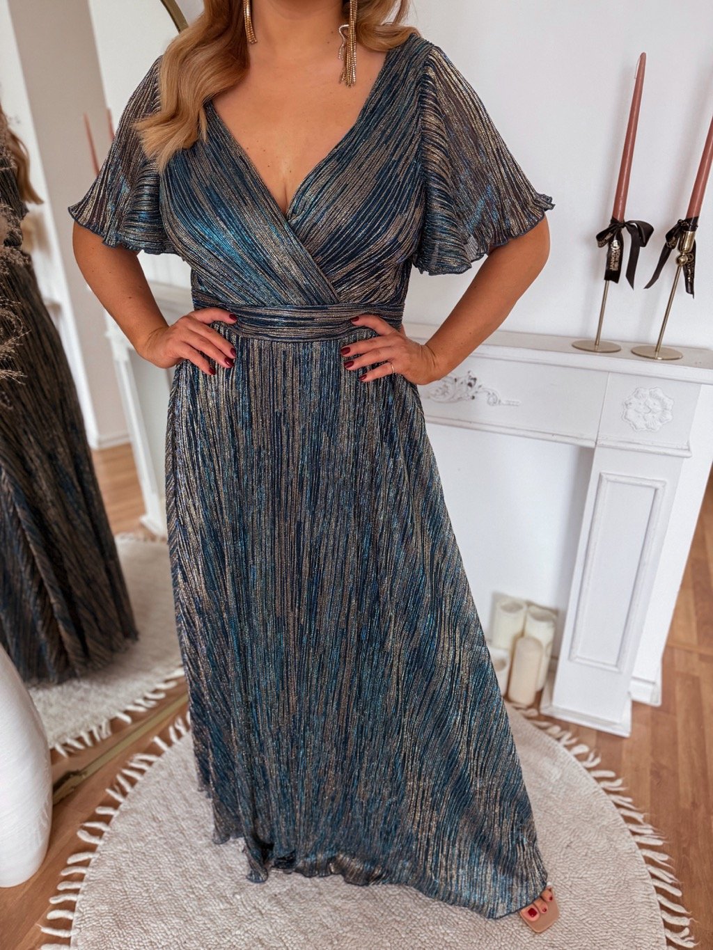 Dlouhé společenské šaty s krátkým rukávem. Šaty se zapínají na zip na zádech, na hrudi mají měkkou pěnovou vycpávku. Modelka měří 168 cm a má na sobě velikost XL.